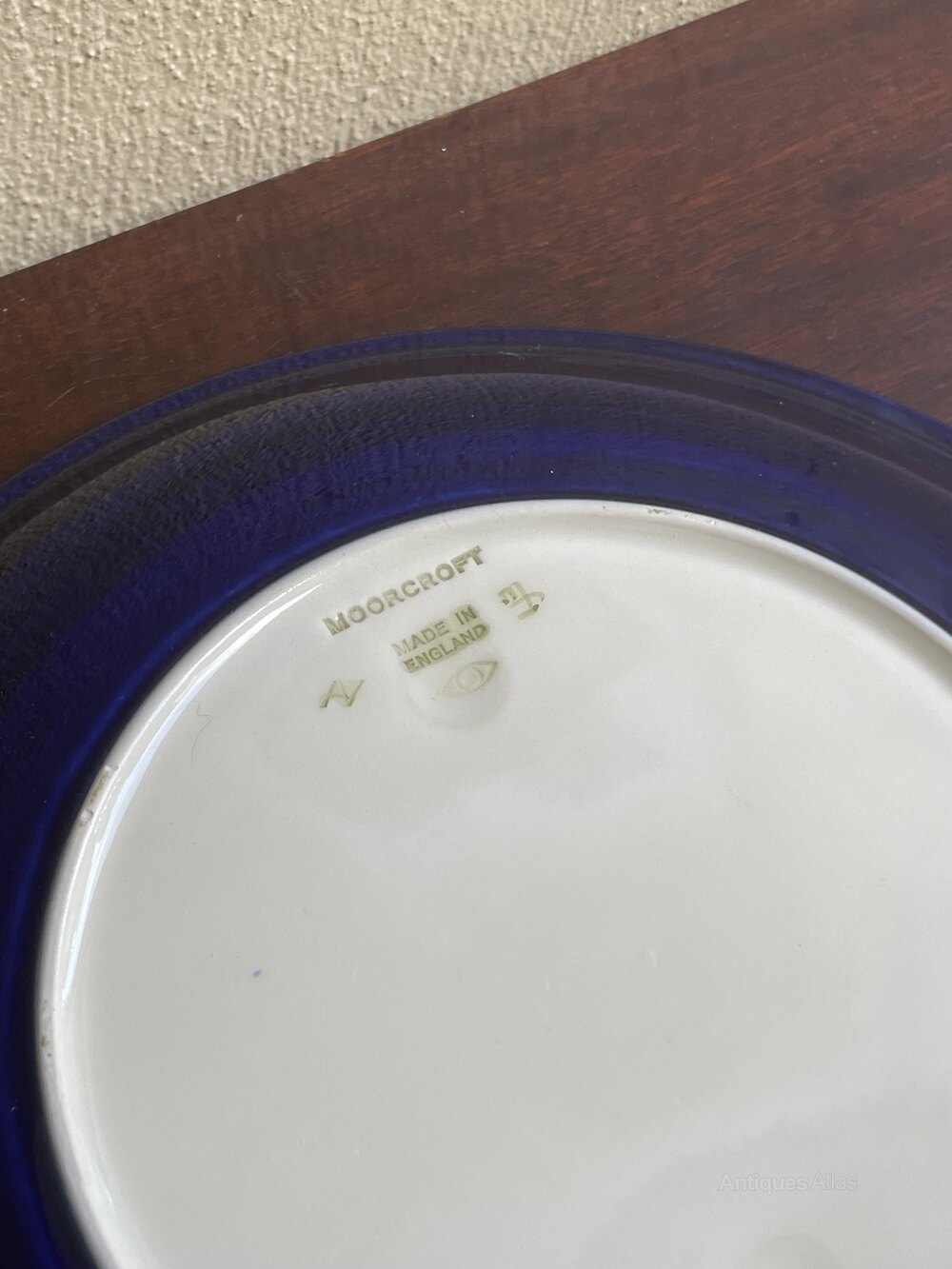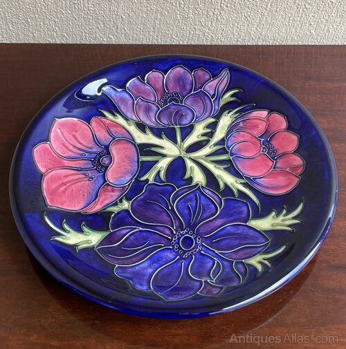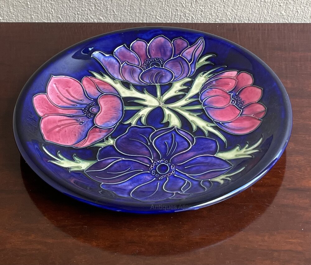 A Moorcroft plate in the Anemone pattern, featuring four large vibrantly coloured flower heads with green foliage, all with tube lined outlines, on a deep cobalt blue background. Impressed marks on base MOORCROFT MADE IN ENGLAND. Signed to base WM for William John Moorcroft. Dated to 1994 with the impressed eye symbol.Dimensions: