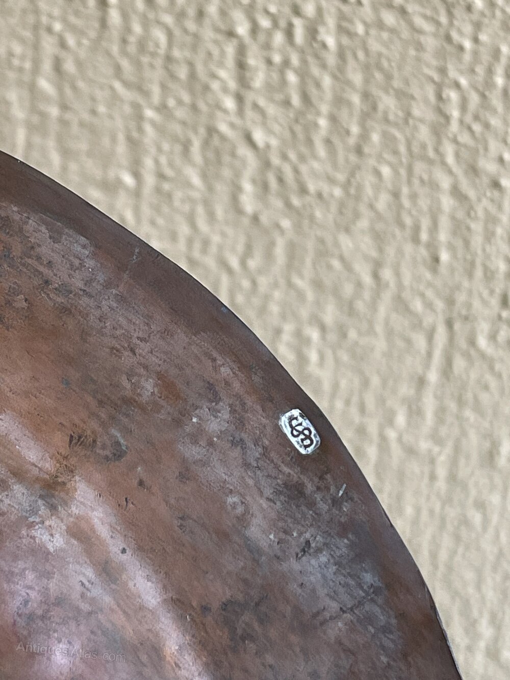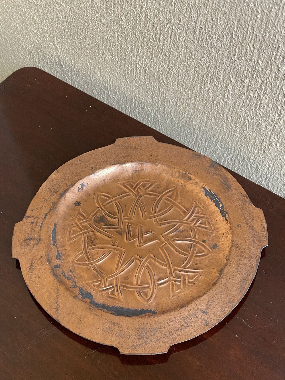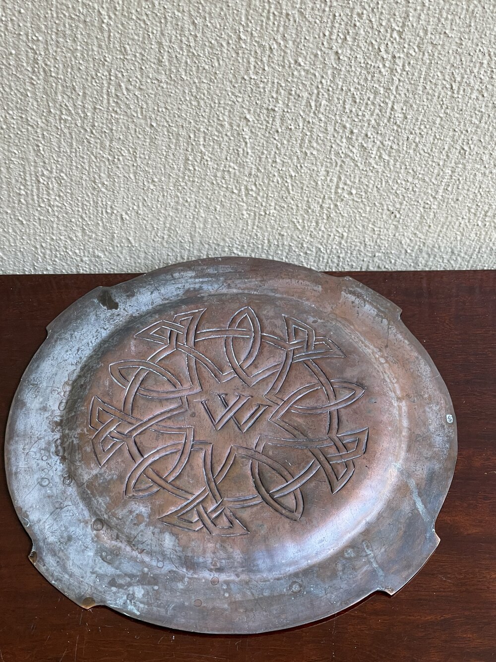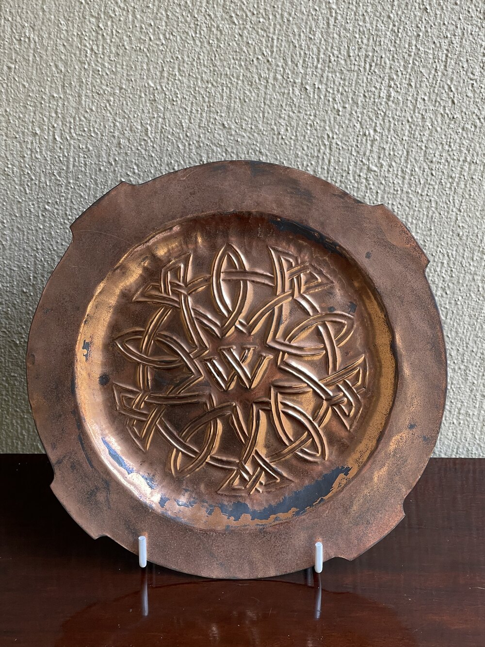 A stylish Arts & Crafts copper plate with wonderful Celtic design with central cartouche initialled W. Stamped with makers mark to reverse.In excellent original condition with pleasing patina.