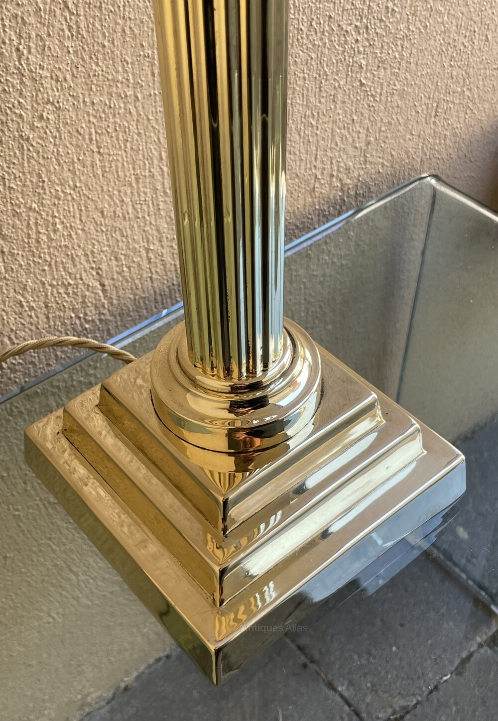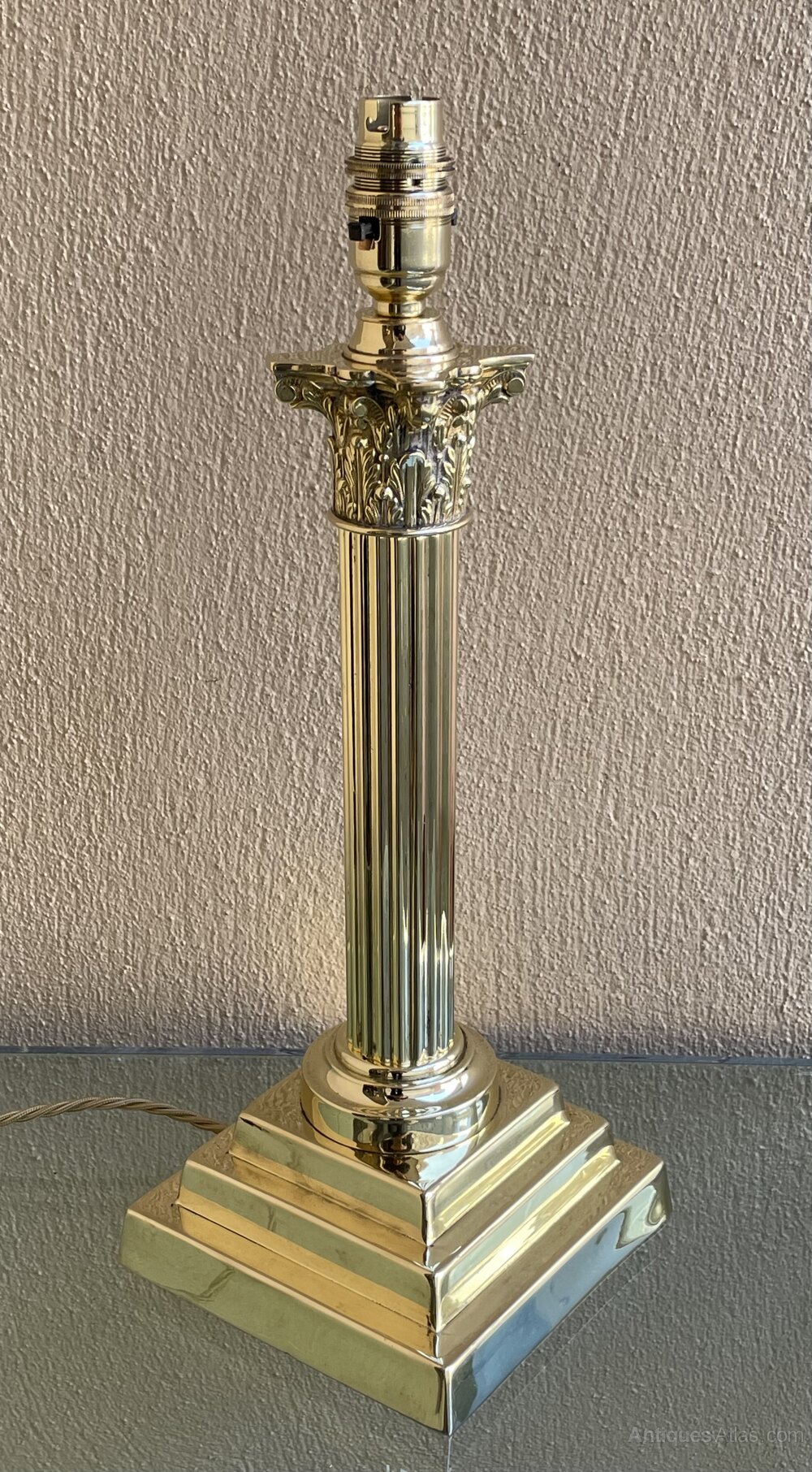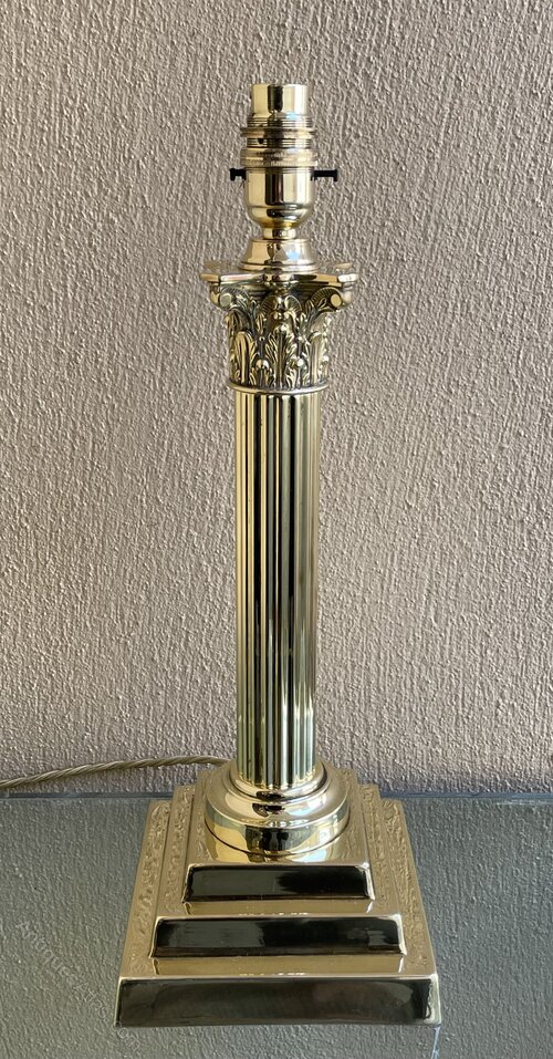 A good Victorian brass Corinthian column table lamp on stepped base.In excellent condition, professionally polished and fully rewired in period style braided flex and PAT safety tested.