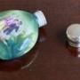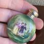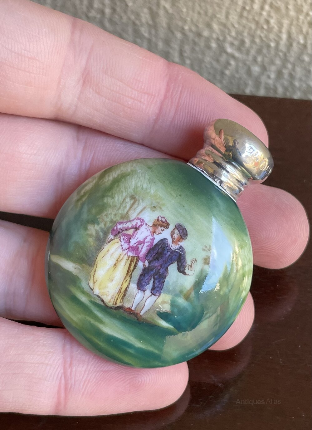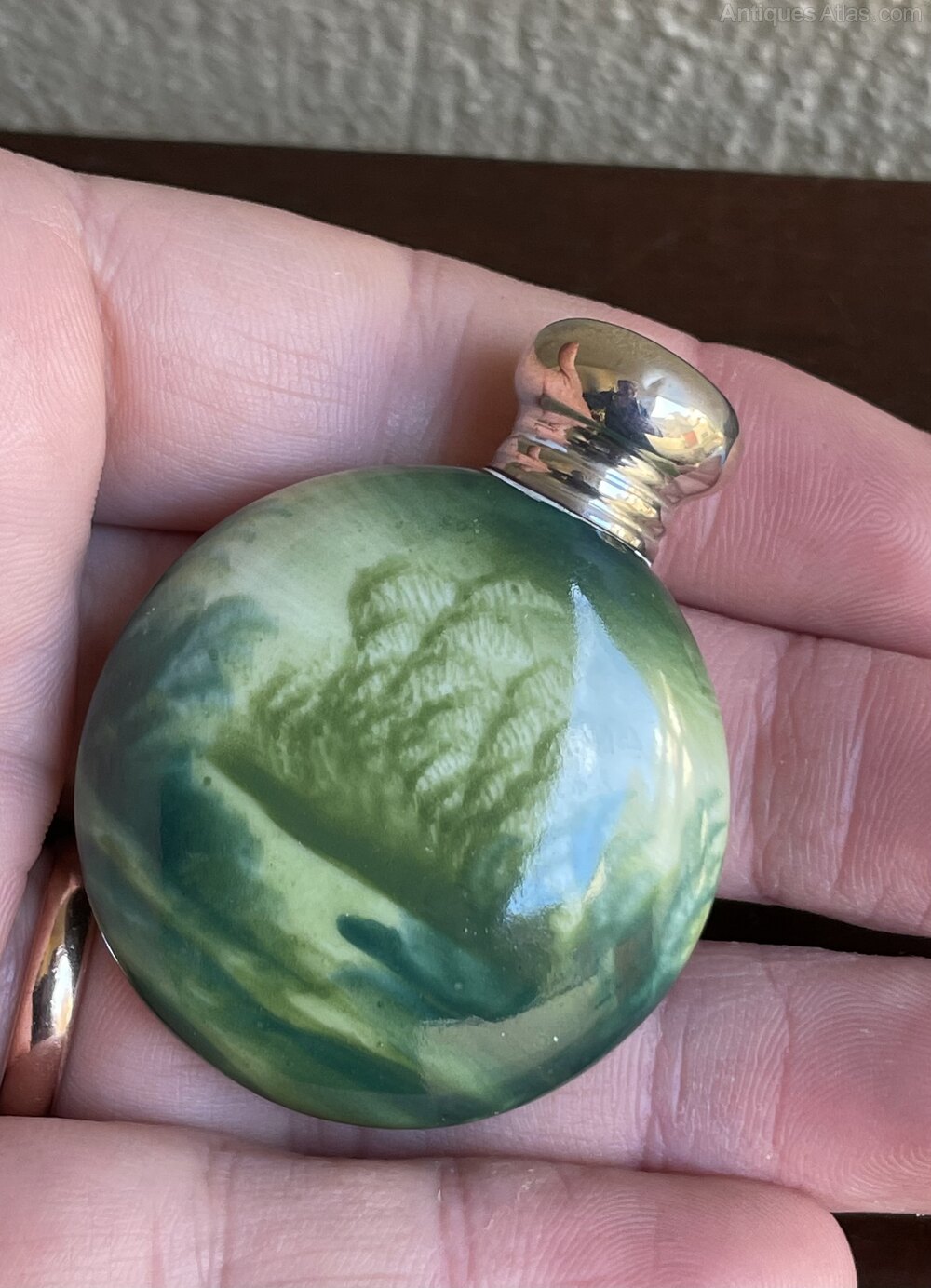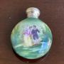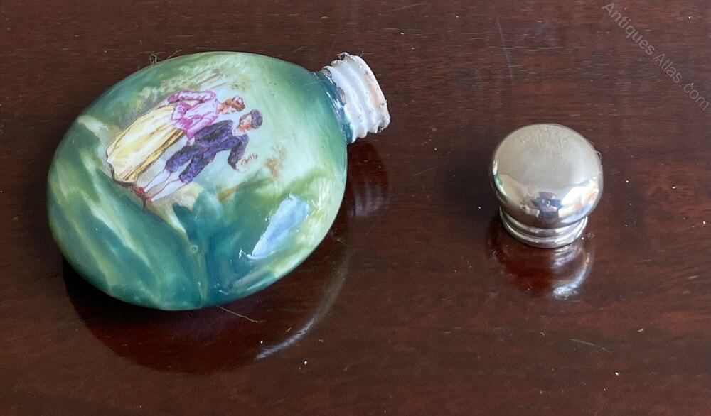 A very pretty Edwardian scent bottle, the top is fully hallmarked and fitted to a very attractive porcelain bottle featuring a classical scene of a couple against a background of trees and greenery. The lid hallmarked Birmingham 1906. The hallmarks are rubbed but decipherable.In excellent condition.