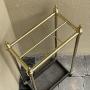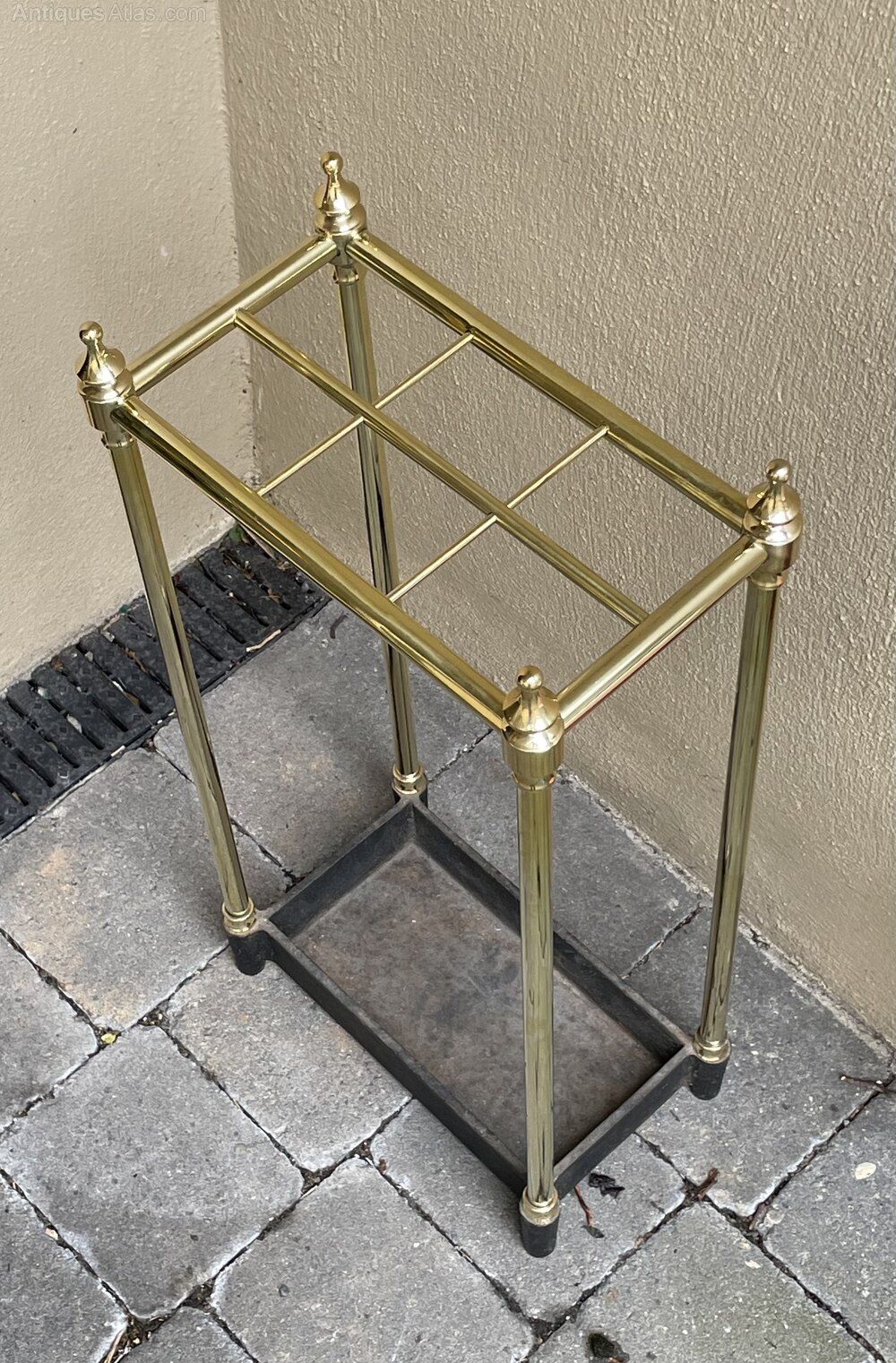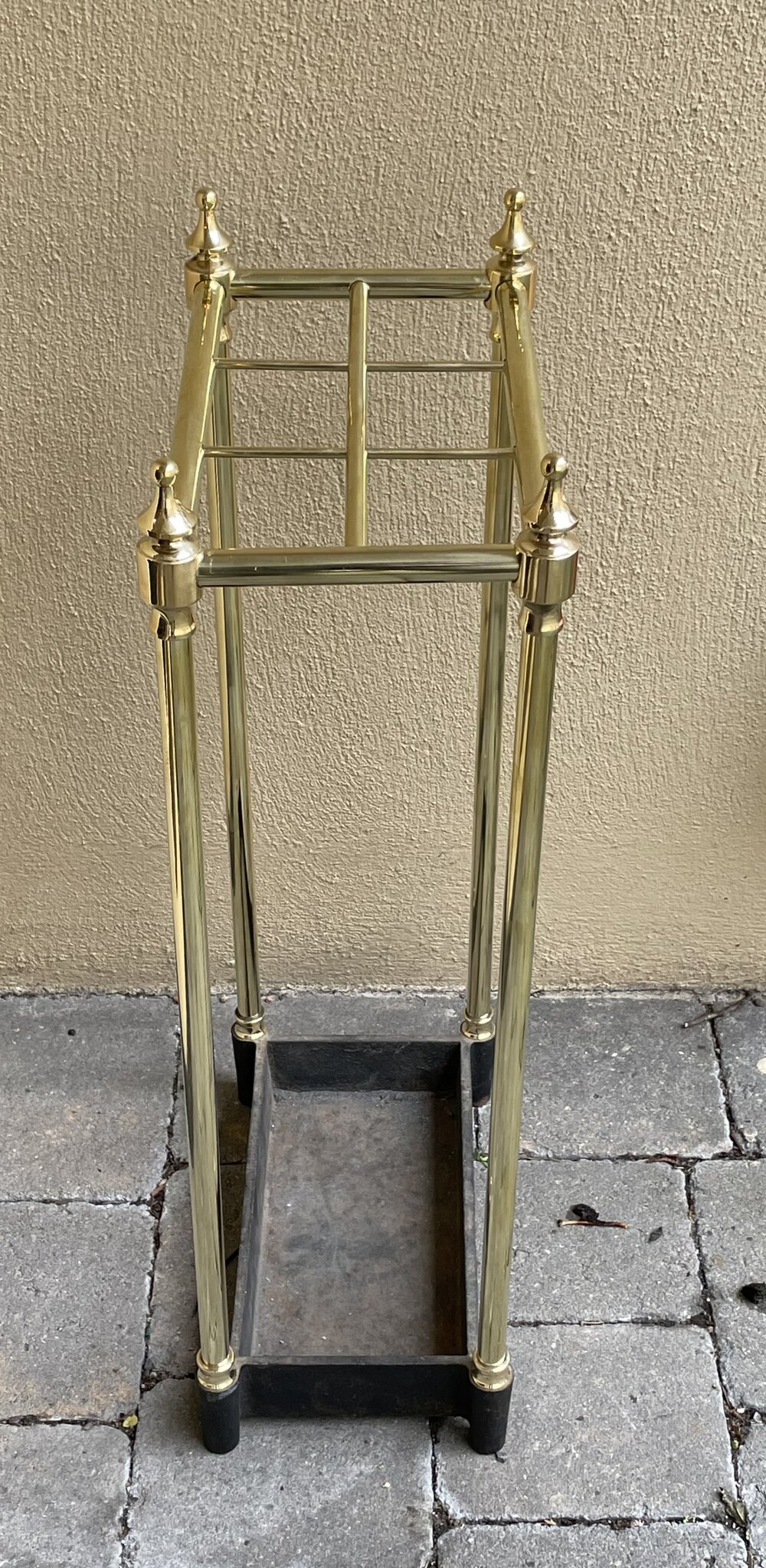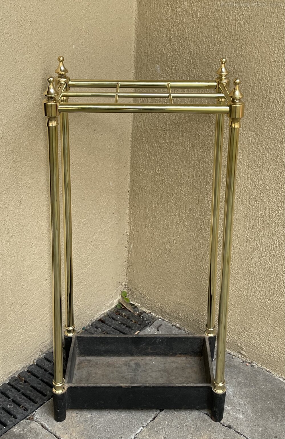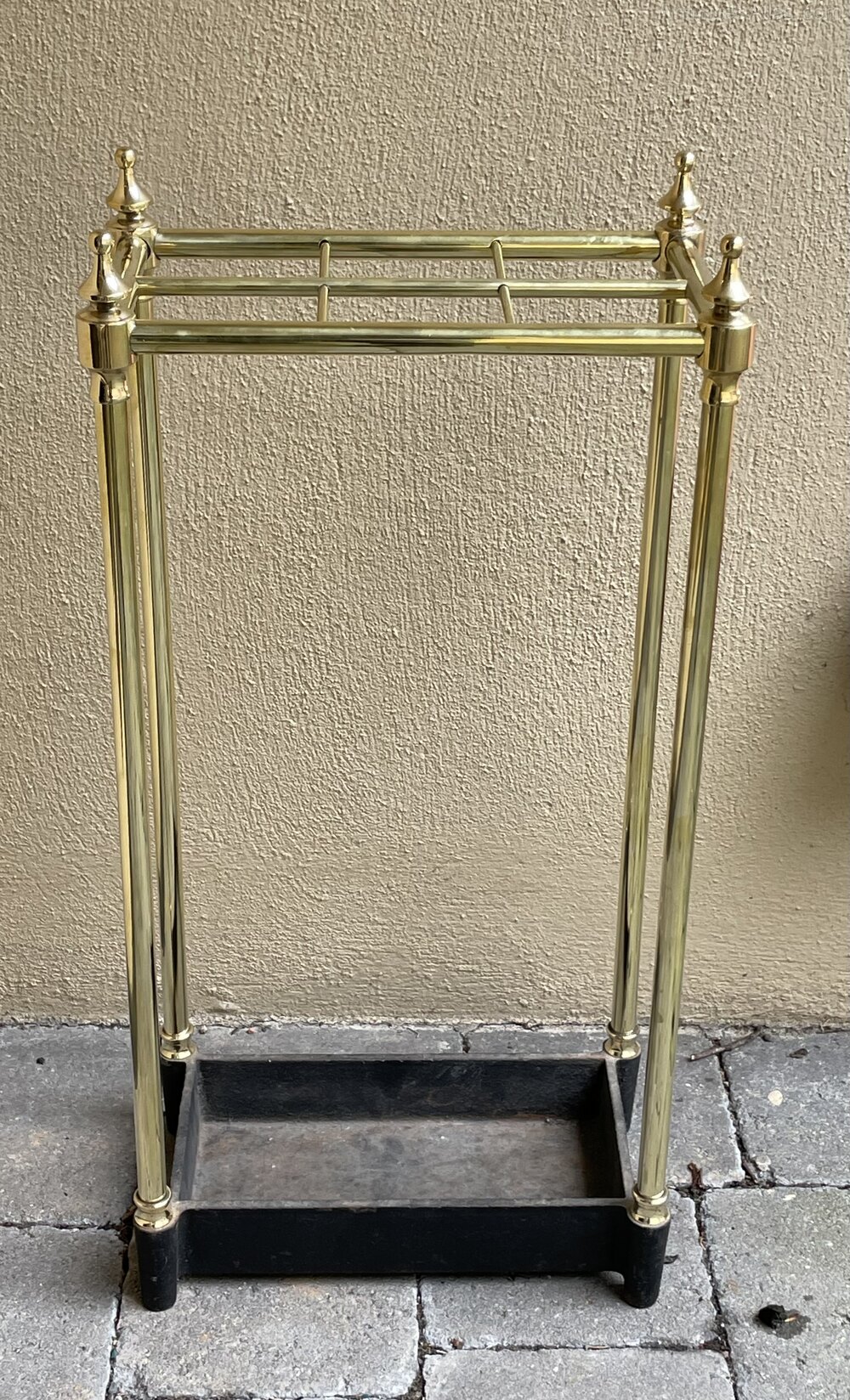 A very smart early 20th century brass umbrella stand with solid brass frame with decorative cast urn shaped finials. Six divisions to hold sticks or umbrellas in position. Cast iron base. c1900/1920.Professionally repolished and ready for a new home.