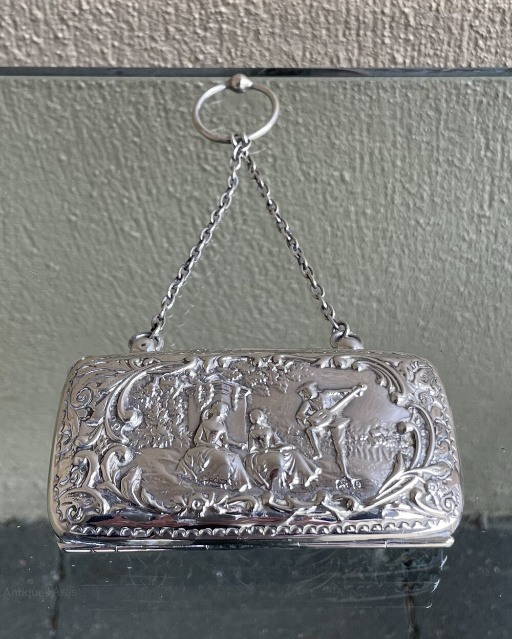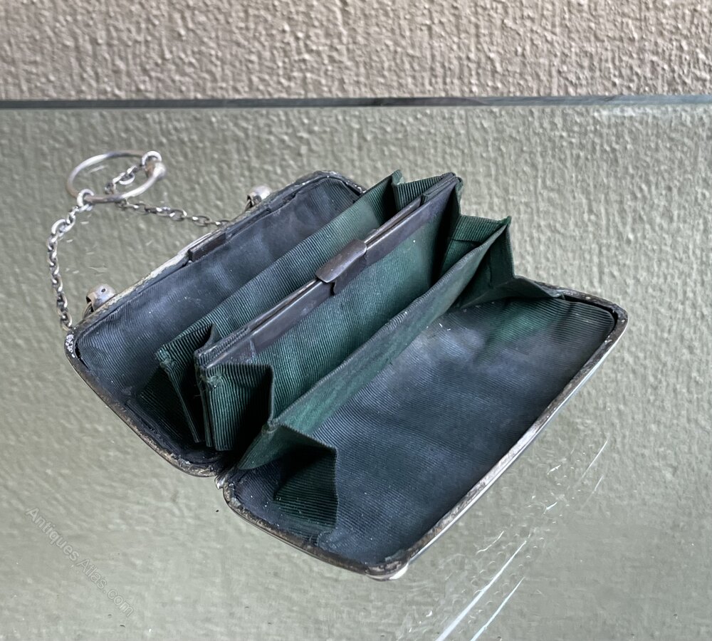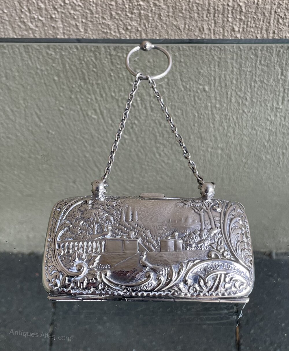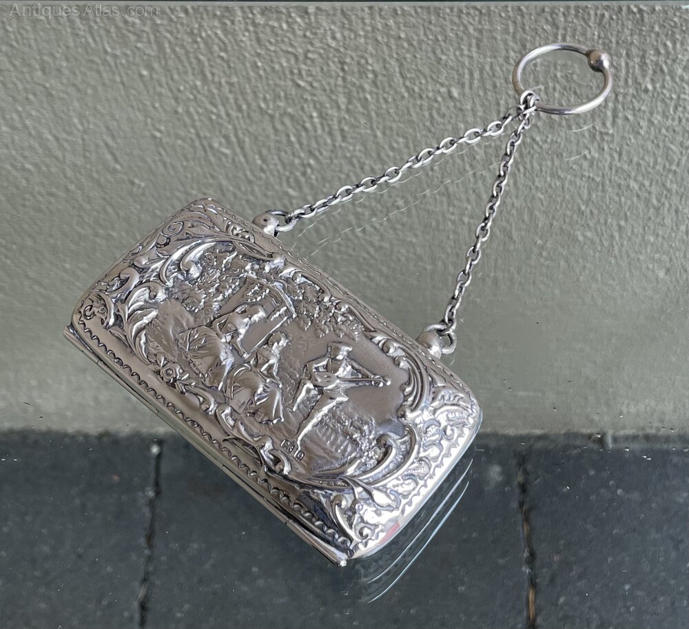 A very good Edwardian period solid silver ladies purse with repoussé decoration depicting a minstrel and two maidens in a castle''s gardens. Opening to green silk lined interior and a chain attachment. A super quality example. Fully hallmarked for Birmingham 1904William Rand Antiques Limited, purveyors of fine furniture, English silver, lighting and Manx paintings. A family run business with a shop in the Isle of Man and an online presence, serving a local and international client base. We pride ourselves on selling quality antiques, where required, sympathetically and authentically restored, ready to be enjoyed by the next generation of custodians.