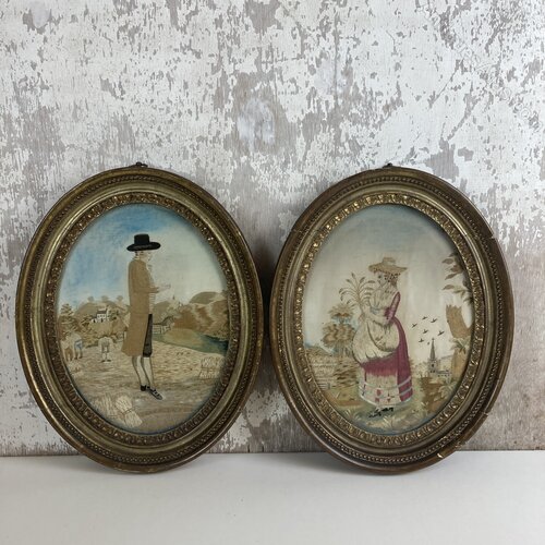 A pair of naïve Regency silk-work pictures of a farmer and his wife and their farm.English circa 1830.