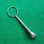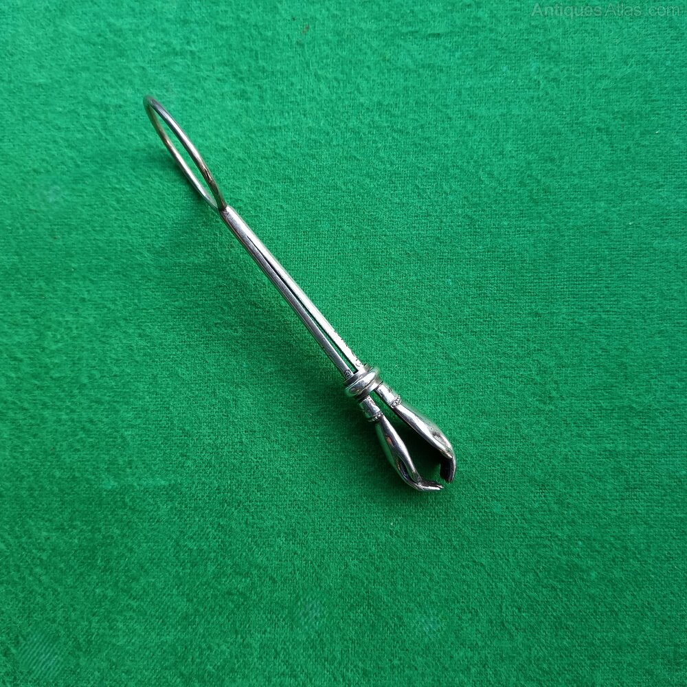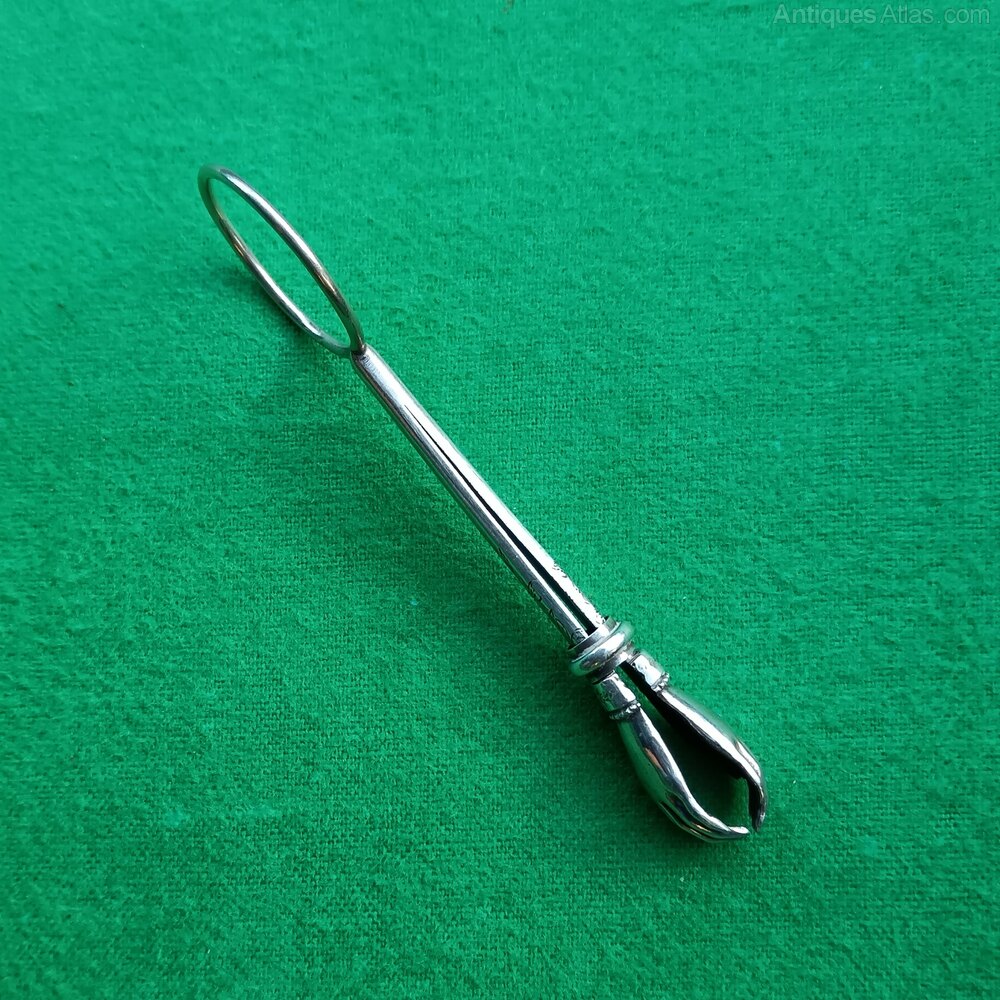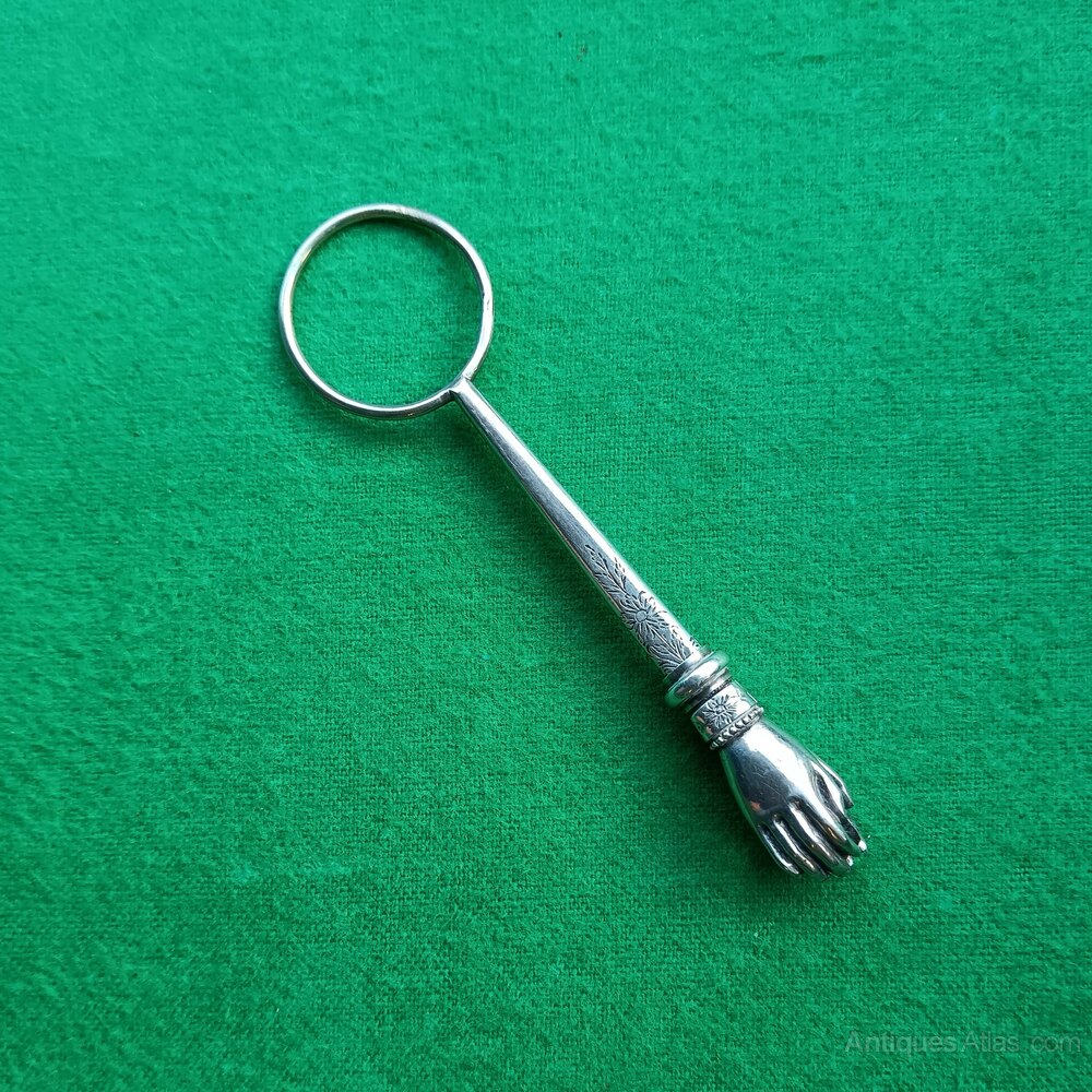This is an antique skirt lifter designed in the form of a pair of hands with engraved blouse sleeves and cuffs. A moulded ring slides along the sleeve to open or close the hands that secure the skirt.It is unmarked but is believed to be made of silver.