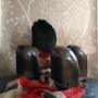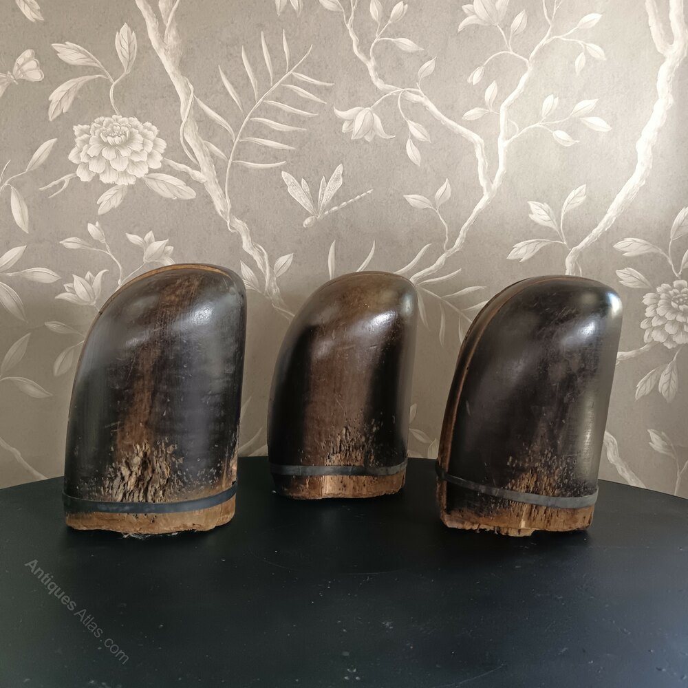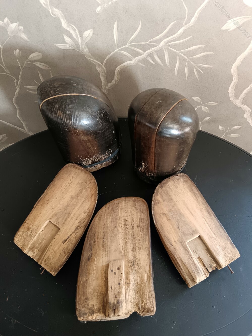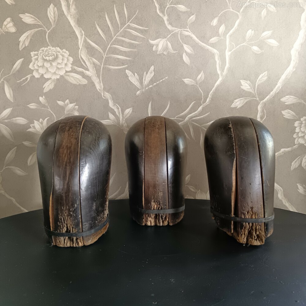 An extraordinary set of three wooden hat blocks, expertly shaped to form the body of the iconic Foot Guards Bearskin Cap.Each block is crafted in three interlocking sections, designed to dismantle neatly within the blocked crown — a clever construction that allowed makers to remove the crown with ease during the hat‑making process.