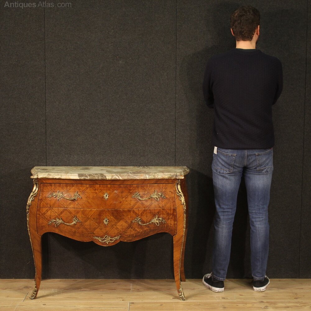 Elegant French chest of drawers from the first half of the 20th century. Wavy and rounded piece of furniture, in Louis XV style, pleasantly adorned with geometric inlay in walnut and maple wood. Dresser equipped with two drawers of good capacity and original marble top of excellent quality. Furniture of great elegance finely adorned with gilded and chiseled bronze (see photo). Bedroom or living room chest of drawers, with beautiful lines and excellent proportions. It shows some small signs of conservative restoration, structurally sound. Furniture in beautiful patina, overall in good condition.As each of our products will be accompanied by a certificate of authenticity and warranty and photographic documentation. Every item will be packed in a custom-made wooden box. Free shipping in Europe and UK (import and custom duties NOT included). Worldwide shipping at affordable prices, ask us a shipping quote. BUY IN INSTALLMENTS INTEREST FREE.