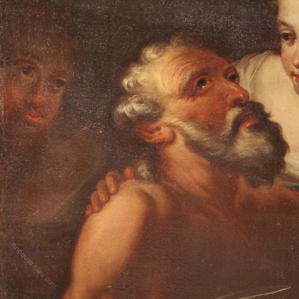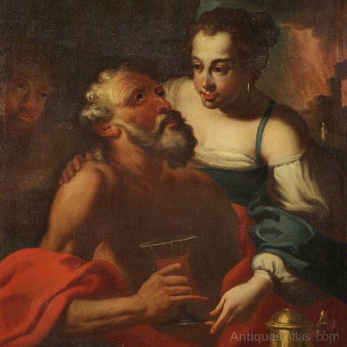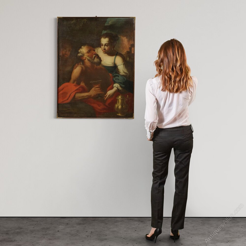 Antique 17th-century Italian painting. Oil on canvas artwork depicting the famous biblical story of Lot and his daughters. After the destruction of Sodom and Gomorrah, Lot takes refuge with his daughters in a cave. The girls, fearing the end of their lineage, decide to get their father drunk and sleep with him to ensure their descendants. A painting of remarkable pictorial quality and emotional intensity, with a Caravaggesque light that shapes the faces and clothes with theatrical elegance in a captivating nocturne. The narrative backdrop depicts the burning city and Lot's wife, transformed into a pillar of salt for disobeying and looking back. Small 20th-century carved wooden frame, beautifully decorated, with some signs of aging. The artwork has already been restored with relining, replacement of the stretcher, and repainting in small areas. Overall, in good condition. Internal dimensions: H 101 x W 76 cm.As each of our products will be accompanied by a certificate of authenticity and warranty and photographic documentation. Every item will be packed in a custom-made wooden box. Free shipping in Europe and UK (import and custom duties NOT included). Worldwide shipping at affordable prices, ask us a shipping quote. BUY IN INSTALLMENTS INTEREST FREE.
