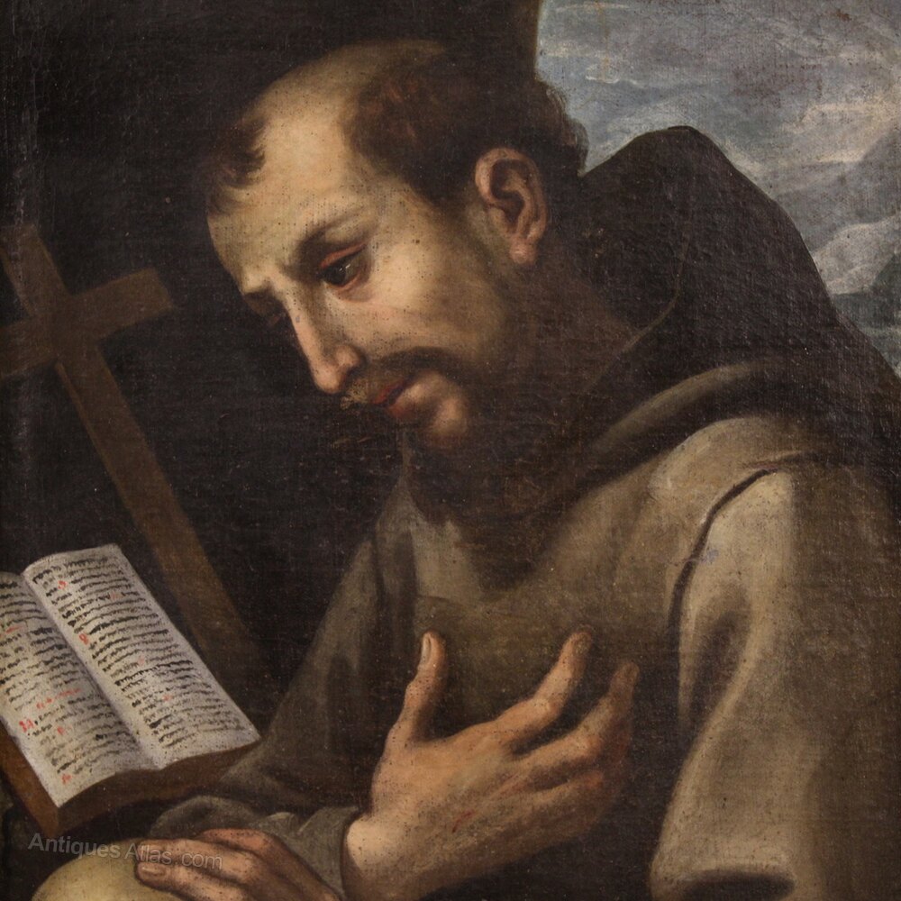 Antique 17th-century Italian painting. Oil on canvas artwork depicting Saint Francis of Assisi in meditation, of remarkable pictorial quality. The saint is depicted in a cave, next to a skull, a book, and a cross, iconographic symbols linked to spirituality and reflection on the transience of life. This exquisitely crafted painting displays a particularly Caravaggesque sensibility in the naturalistic rendering of the face, hands, and skull.A painting of great devotional impact, ideal for collectors of sacred art and suitable for both classic and modern settings. A 20th-century carved and gilded wooden frame, with some loss of gilding. The painting has already been restored with relining, replacement of the stretcher, and restoration of color in small areas overall, it is in good condition. Internal dimensions: H 61.5 x W 47 cm.