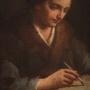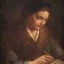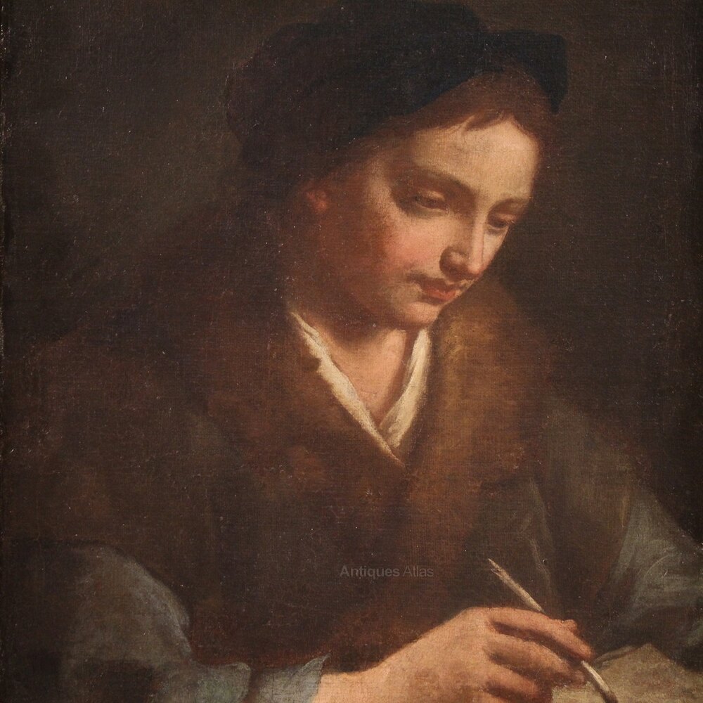 Antique 17th-century Italian painting. Oil on canvas artwork depicting the portrait of a young scholar/artist with excellent painting skills. The painting is adorned with a richly carved and gilded modern frame, beautifully decorated. The painting, which extends vertically, is of excellent proportion and easily fits into any room in the home.The artwork has undergone conservative restoration, including relining, replacement of the stretcher, and retouching of small areas of color. The figure is beautifully painted down to the smallest details, from the unusual hat to the nib between the fingers. This painting has great character and is difficult to find for its subject and quality. In good condition. Internal dimensions: H 63 x W 49 cm.