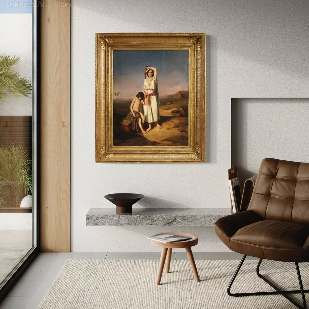 A refined French painting from the second half of the 19th century. Oil on canvas, first canvas, artwork depicting a captivating biblical scene: Hagar with the young Ishmael in a desert landscape. An Egyptian slave and mother of Abraham's firstborn, Hagar was banished with her son Ishmael by order of Sarah, the Prophet's first wife. Wandering in the desert, mother and son suffer from thirst until God intervenes by sending an angel to save them.The composition is balanced, the drawing accurate, while the arid landscape and earthy colors accentuate the drama of the narrative. The painting combines narrative sentiment with a sober stylistic language. The contemporary frame in wood and gilded gesso is particularly valuable, enhancing the beautifully decorated artwork, with some signs of aging and small missing decorations on the outer border. Perfect for classical or eclectic environments, this canvas is a significant example of the 19th-century French tradition.