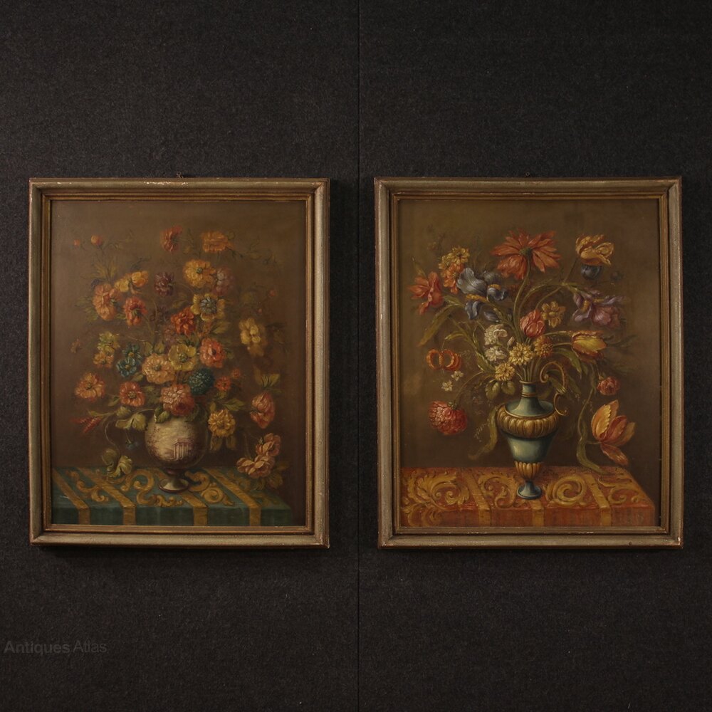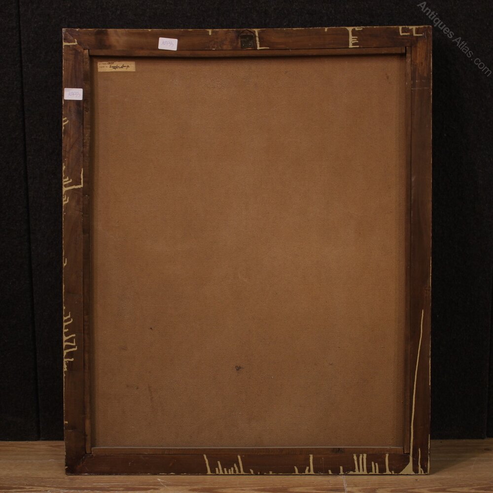 Italian painting from the mid-20th century. Artwork oil on masonite depicting an elegant still life, vase with flowers, of good pictorial quality. Painting of good size and pleasant decor adorned with a lacquered wooden frame with some small signs of the time. The contrast between the blue of the vase and the colors of the petals is elegant (see photo). Good brightness, part of a pair (see photo and ask for the price of the pair, if available). In good condition. Sight size H 73 x W 58 cm.As each of our products will be accompanied by a certificate of authenticity and warranty and photographic documentation. Every item will be packed in a custom-made wooden box. Free shipping in Europe and UK (import and custom duties NOT included). Worldwide shipping at affordable prices, ask us a shipping quote. BUY IN INSTALLMENTS INTEREST FREE.