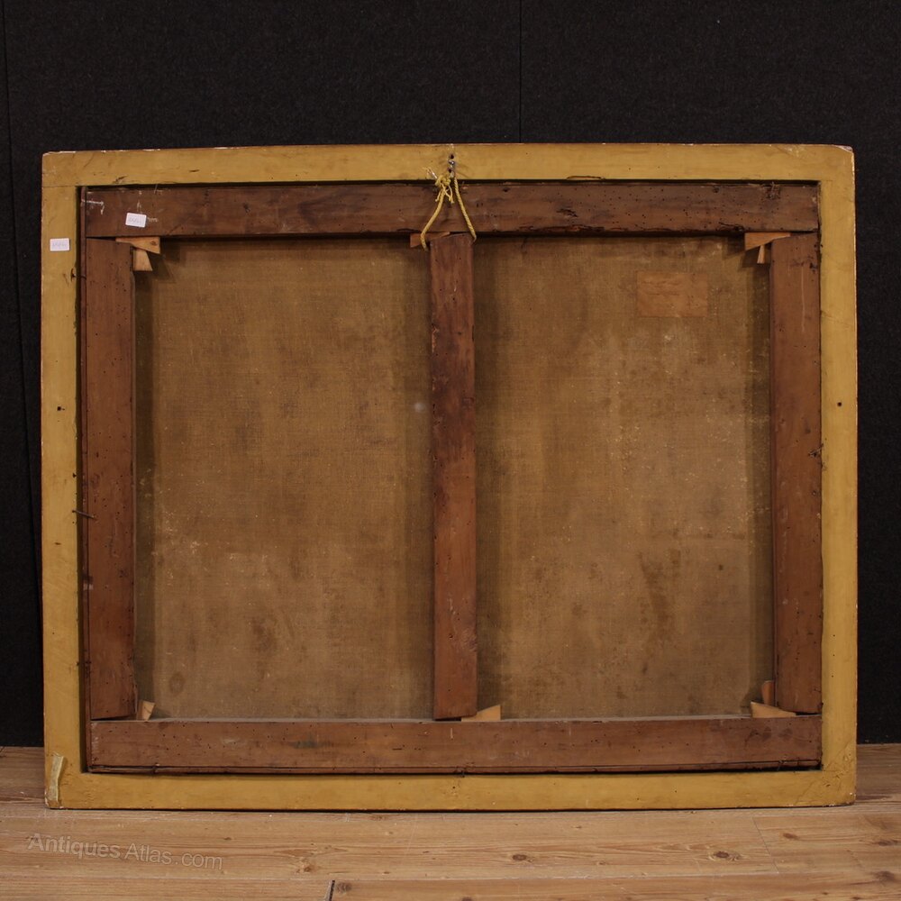 20th-century carved and gilded wooden frame, beautifully decorated, with some signs of aging. The painting has already been restored with re-lining, replacement of the stretcher, and recoloring in small areas. Overall, it is in good condition. Internal dimensions: H 98.5 x W 125 cm.