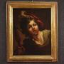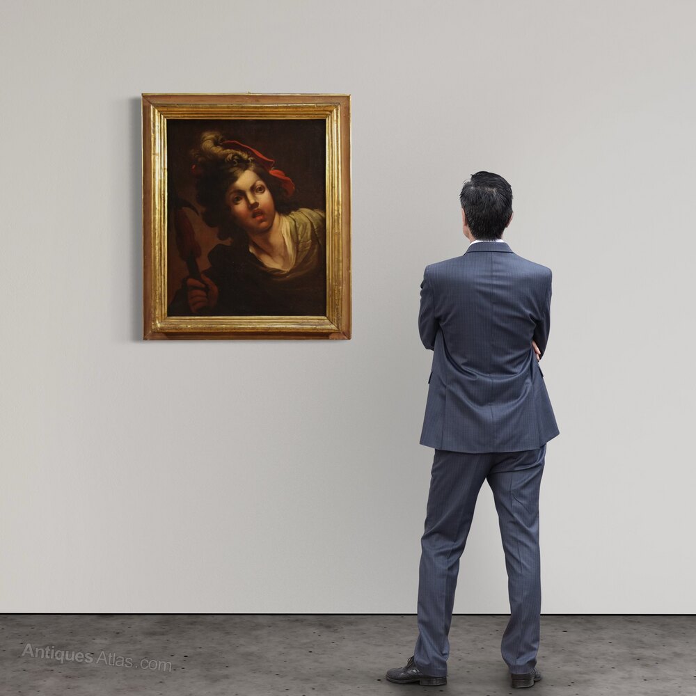 Antique French painting from the first half of the 18th century. Oil on canvas artwork depicting a young warrior caught in a moment of surprise. The face is slightly turned, the gaze off-camera, the mouth slightly open, the spear firmly held: all elements that create a moment of psychological suspension, the moment in which thought precedes action.Painting attributed to the great painter Alexis Grimou (1678-1733), known as the French Rembrandt, famous for his intimate painting influenced by the Flemish tradition. The painting displays some of his distinctive features: a soft and psychologically profound style, with warm skin tones and a soft light (the work is not currently accompanied by an expert opinion, but it can be requested upon payment of the relevant additional costs).
