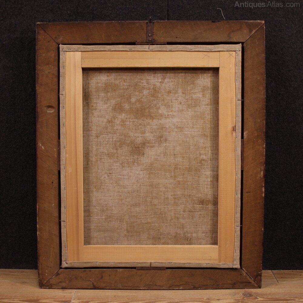20th-century frame in carved and gilded wood, beautifully decorated, with some signs of aging. A painting of remarkable pictorial quality and an ideal format, perfect for a professional studio and suitable for prestigious spaces, whether classic or contemporary. The painting has already been restored with relining, replacement of the stretcher, and restoration of the color in small areas. Overall, it is in good condition. Internal dimensions: H 69.5 x W 55 cm.