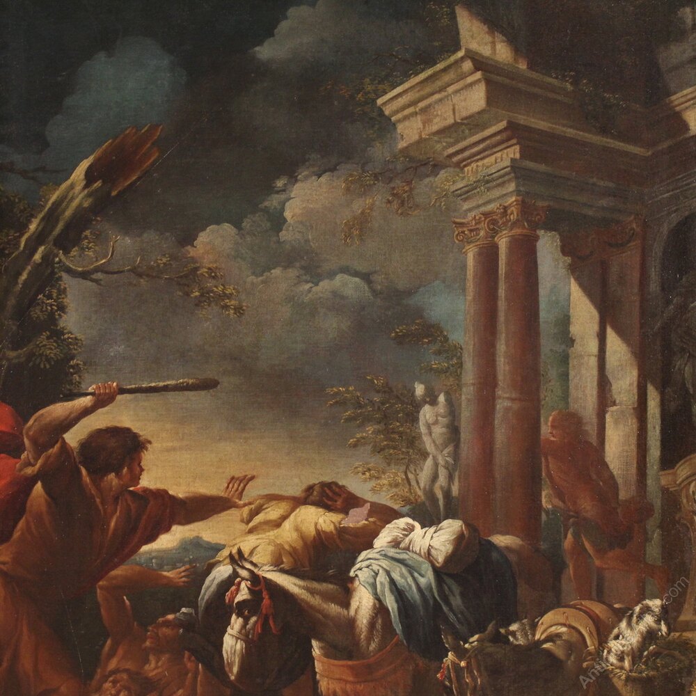 Magnificent Italian painting from the first half of the 18th century. This artwork oil on canvas depicts the biblical episode of Moses driving the shepherds from the well of Midian. Having fled Egypt, Moses helps Jethro's daughters by driving away the shepherds who were preventing them from drawing water from the well. The canvas clearly reveals the hand of the great Neapolitan artist Domenico Brandi (1684-1736), one of the greatest exponents of animal painting.A son of an artist, Brandi also worked in Rome in the workshop of Rosa da Tivoli, where he acquired the master's bucolic and illustrative flair. Worthy of note is the quality of the execution in the landscape, with splendid classical ruins, and the pack animals, almost protagonists of the composition and depicted with anatomical precision. (The painting is not currently accompanied by an expert opinion, but one can be requested upon payment of the relevant additional costs.)