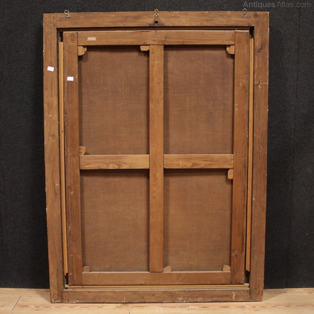 A large, impactful painting, ideal for a reception room or prestigious professional studio. A scenic 20th-century frame, beautifully decorated, with some small losses and signs of aging. The painting has already been restored with re-lining, replacement of the stretcher, and restoration of the color in small areas. It has some noticeable paint drops in the central section (see photo), easily restoreable, and is in overall good condition. Internal dimensions: H 148.5 x W 105 cm.