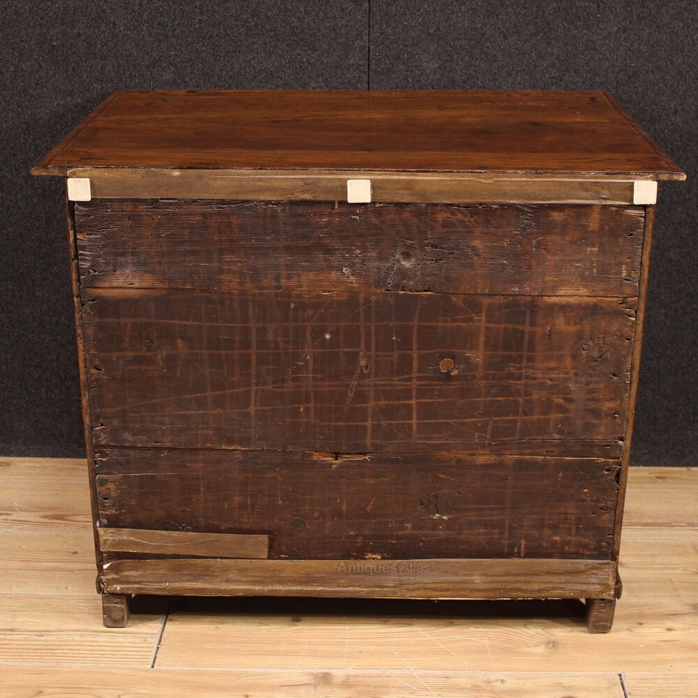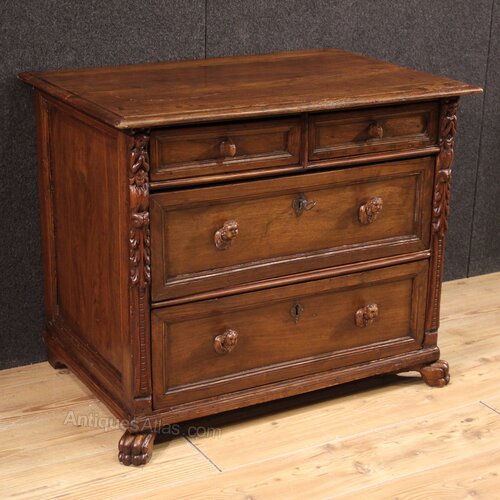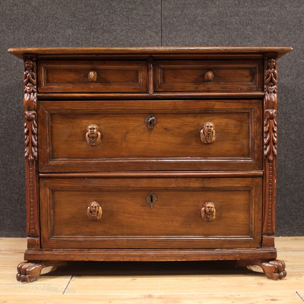 Antique Genoese 18th-century bambocci chest of drawers. Carved walnut, finely adorned with feral feet on the front, side pilasters with floral decorations and praying figures, and anthropomorphic handles, two of which are zoomorphic on the upper drawers. The commode features two parallel drawers under the wooden top, with an owl's beak motif, and two larger drawers underneath.This beautifully proportioned dresser is ideal for a bedroom or living room. With good capacity and practicality, this chest of drawers is a rare find for antique dealers and interior decorators. It has undergone some minor conservative restoration work over time, but remains structurally original, sound, and solid. Complete with a working key, it is in good condition and has a beautiful patina.