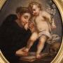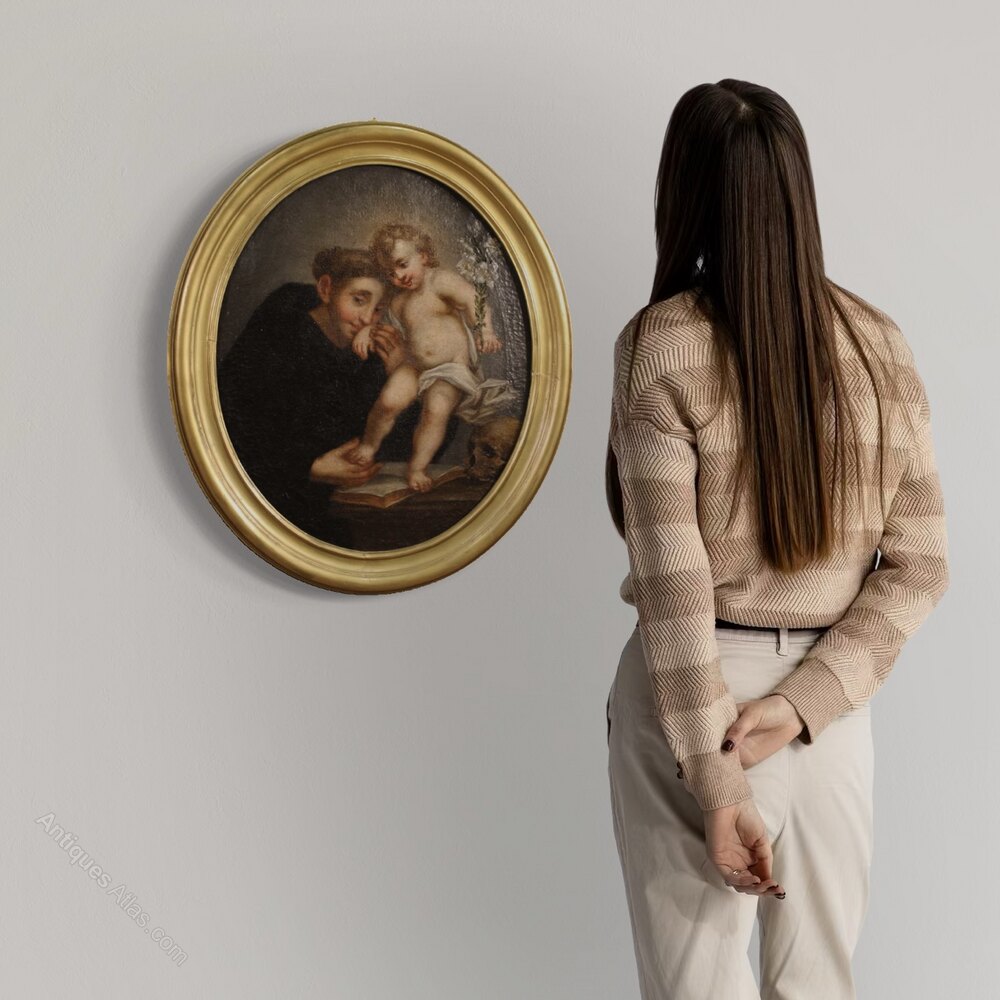 Antique 18th-century Italian painting. Oil on canvas, first canvas, artwork depicting a religious subject, Saint Anthony of Padua with the baby Jesus, with good pictorial quality. An oval painting adorned with a non-contemporary 20th-century carved and gilded frame, beautifully decorated. The artwork depicts the baby Jesus standing on a table with a lily in his left hand (see photo).The details of the book and the skull at Jesus' feet are pleasing. The painting has undergone conservative restoration, with small areas of color restoration, a replacement of the stretcher, and a small patch on the back (see photo). This artwork has a beautiful patina, suitable for antique dealers and collectors, and is in good condition. Internal dimensions: H 53 x W 43 cm.