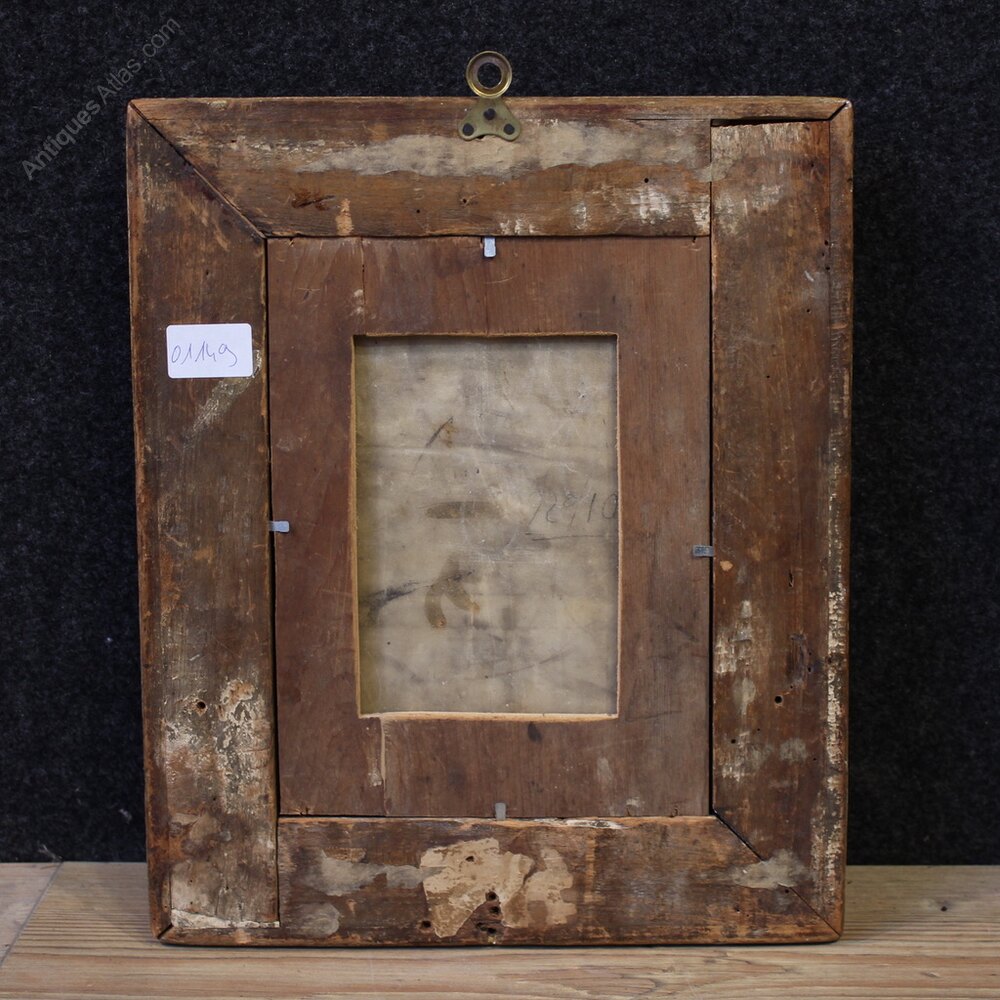 These paintings were created on high-quality supports and in formats suitable for easy transport. The painting is striking for its extraordinary pictorial finesse and the luminosity afforded by the precious marble support. A refined and extremely rare work, ideal for a study, or a perfect addition to a Wunderkammer collection, the so-called cabinet of curiosities. The 19th-century frame is carved and gilded wood, with some signs of aging. Overall, the painting is in good condition. Internal dimensions: H 22 x W 16 cm.
