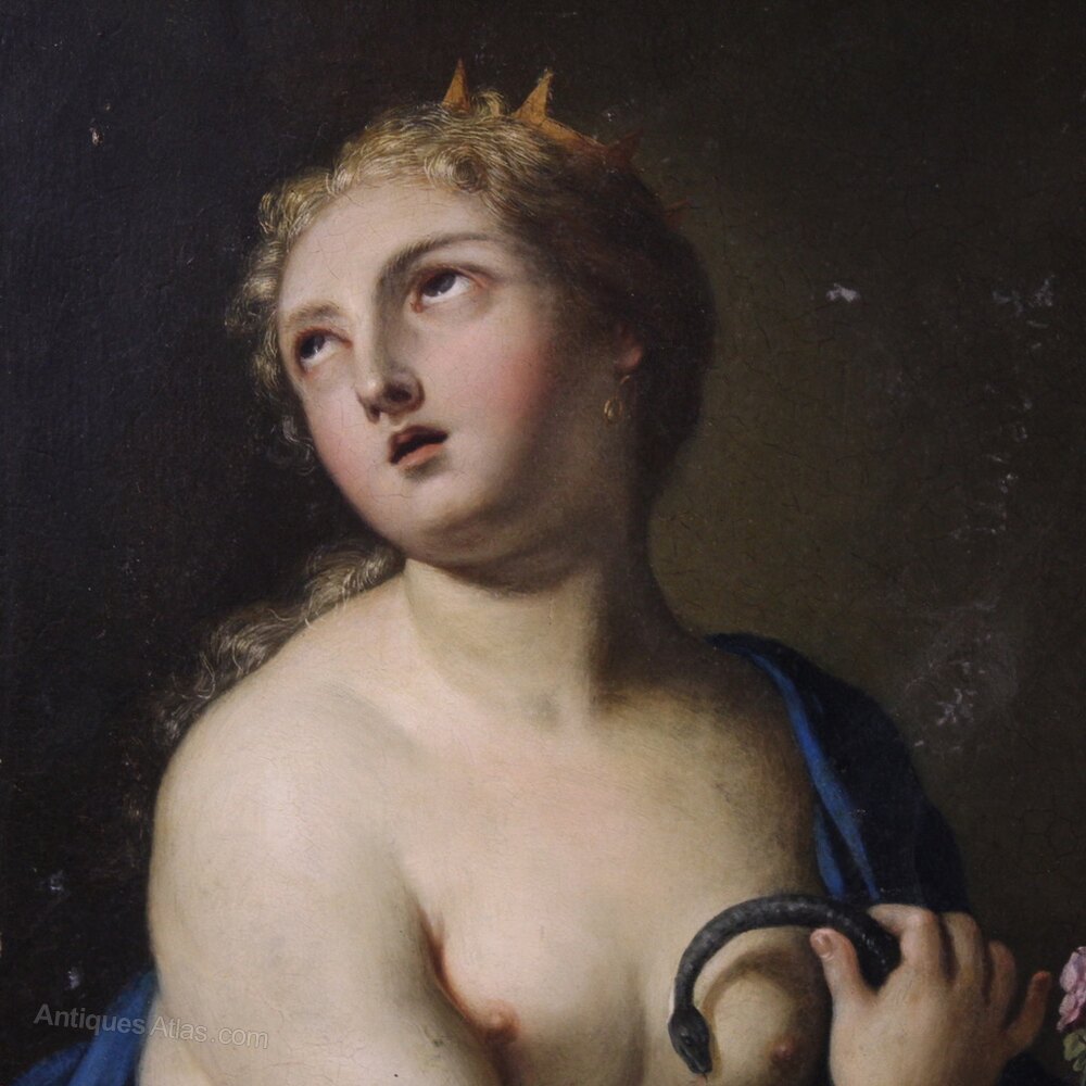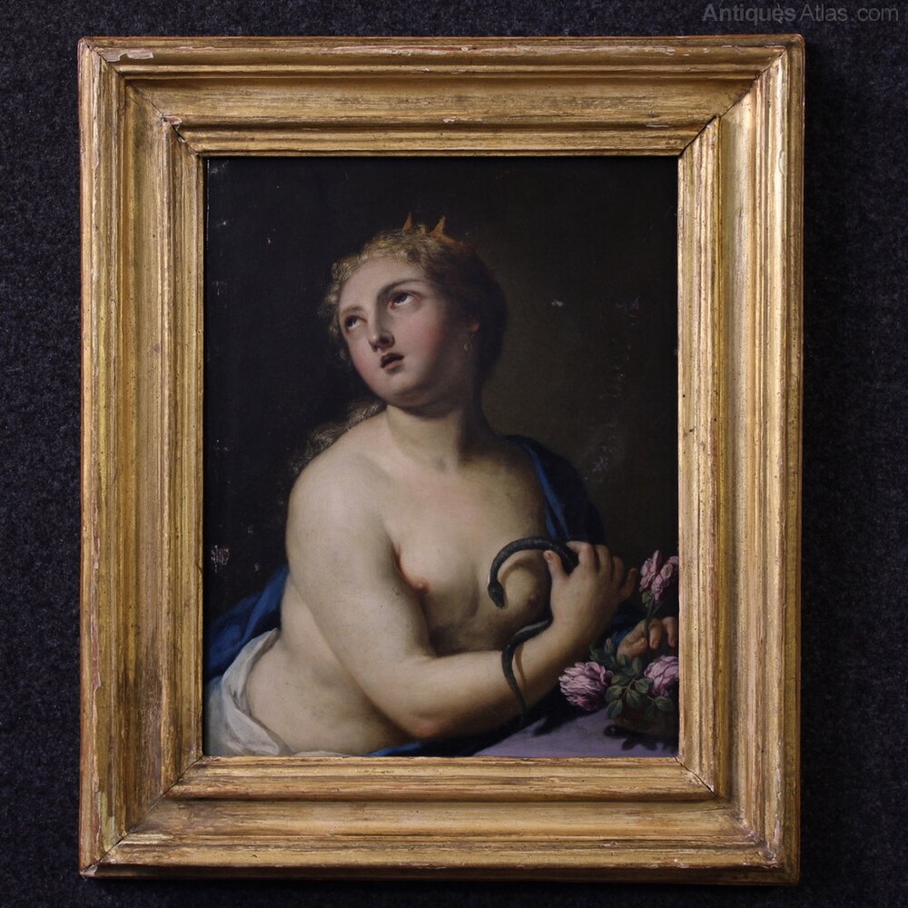 A magnificent Italian painting from the first half of the 18th century. This painting oil on copper depicts the intense death of Cleopatra, an artwork of extraordinary pictorial quality. The last queen of Egypt, she was one of the most powerful and tragic figures of antiquity. After the defeat of Anthony, Cleopatra chose death rather than be exhibited as a trophy in Rome. Tradition holds that she took her own life by being bitten by a snake, and the artist captures the inner moment of her decision.The queen is portrayed in a moment of suspension, when life has not yet been abandoned, regal even in death and mistress of her own destiny. The flowers on the table reiterate the theme of vanitas—beauty, power, and glory are always destined to fade. This artwork can be attributed to the great Italian painter Francesco Trevisani (1656-1746). The figure, idealized and imbued with a composed melancholy, embodies the master's lyrical language.