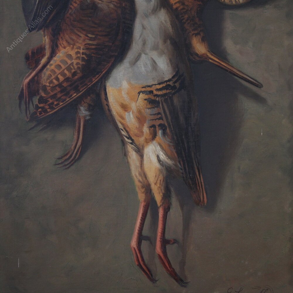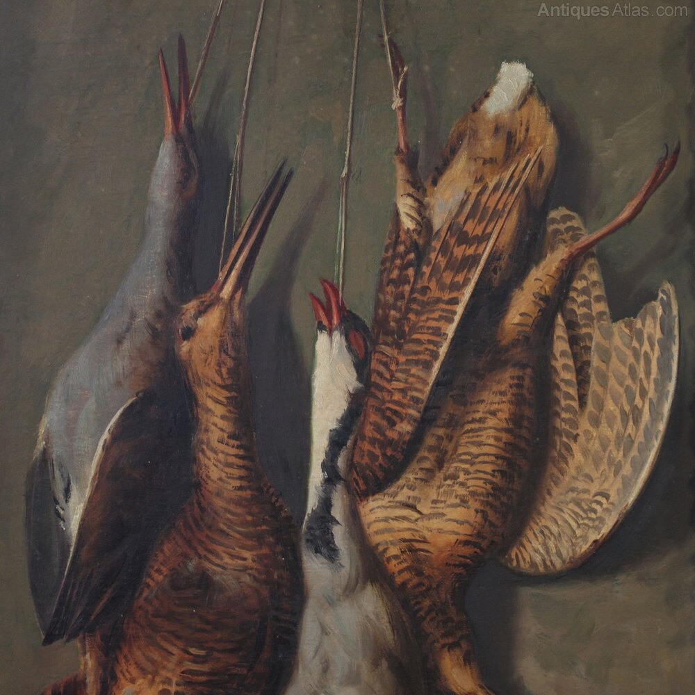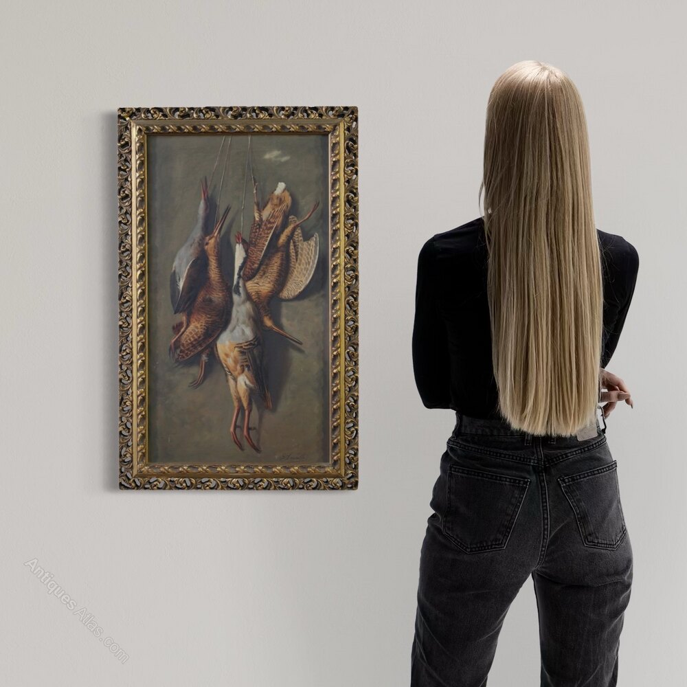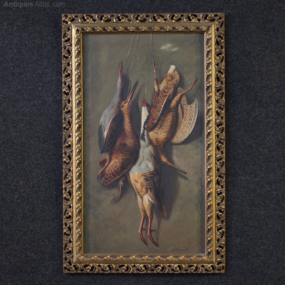Italian painting from the first half of the 20th century. Painting oil on board depicting a still life with game, well-executed. The vertical painting is adorned with a beautifully decorated, carved and gilded (bronze-stained) wood and plaster frame.Signed lower right: G. Lavalle (see photo), attributed to the painter Giovanni Lavalle (1877-1955). Authentication is missing. This painting is part of a pendant (see photo and request the price of the pair, if available). A painting for antique dealers and collectors of still lifes, of a good size and attractive decor. In good condition and with a lovely patina. Interior size: H 68.5 x W 38 cm.