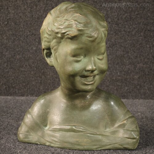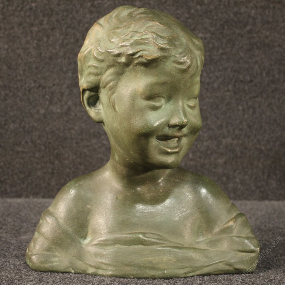 Italian terracotta sculpture from the first half of the 20th century. Finely chiseled work in bronze painted terracotta depicting the bust of a child. Beautifully sized and pleasantly decorated object, without stamps or signatures. Work for antique dealers, interior decorators and collectors of Italian sculptures. Sculpture in good condition with some small signs of aging. Without cracks or signs of restoration.As each of our products will be accompanied by a certificate of authenticity and warranty and photographic documentation. Every item will be packed in a custom-made wooden box. Free shipping in Europe and UK (import and custom duties NOT included). Worldwide shipping at affordable prices, ask us a shipping quote. BUY IN INSTALLMENTS INTEREST FREE.