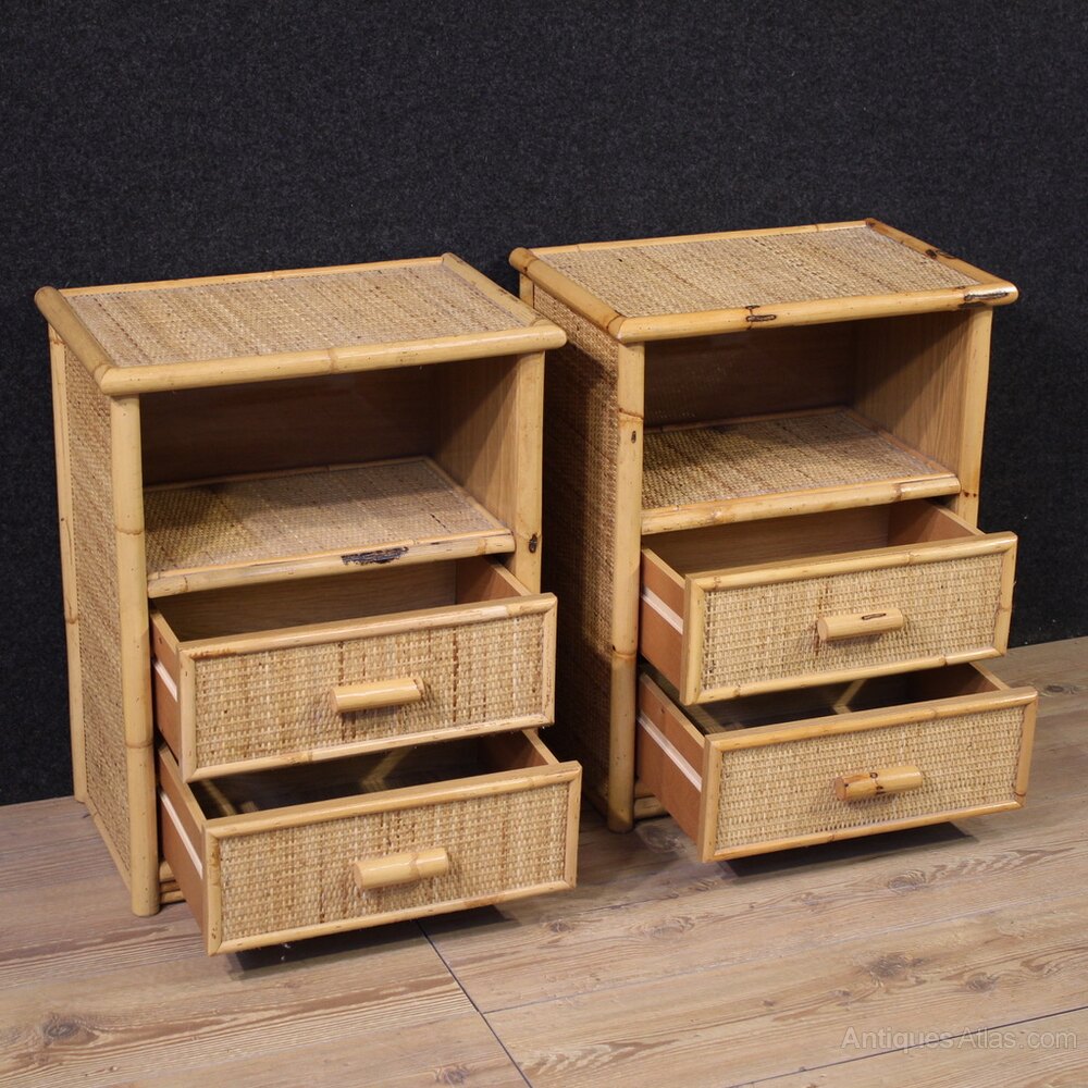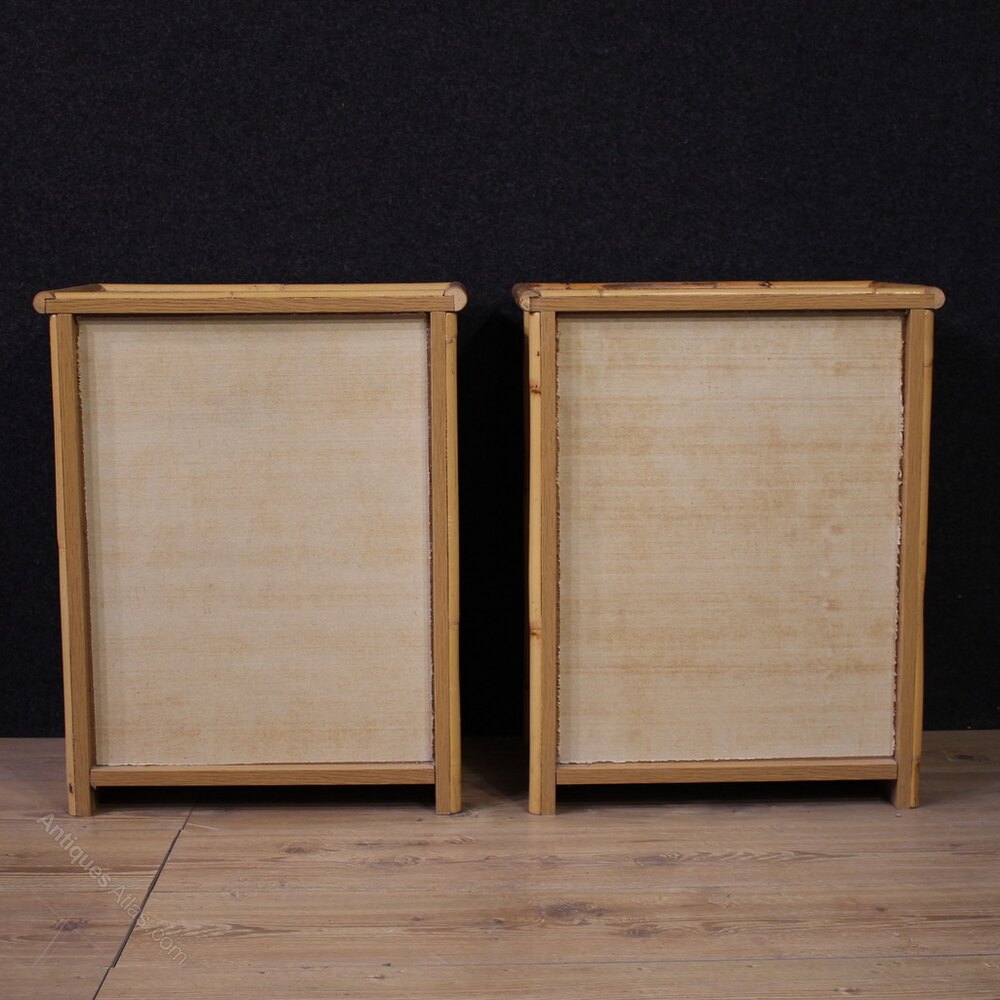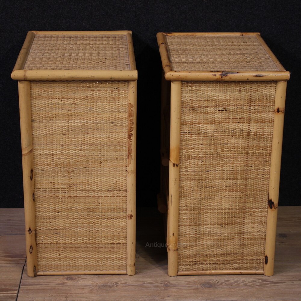 Pair of Italian nightstands from the 1980s. Rattan and bamboo furniture of beautiful lines and a pleasing décor. These nightstands feature two drawers, an open compartment, and a characterful top, making them ideal for use in a bedroom or living room, and are ideal for antique dealers and interior decorators. In good condition.As each of our products will be accompanied by a certificate of authenticity and warranty and photographic documentation. Every item will be packed in a custom-made wooden box. Free shipping in Europe and UK (import and custom duties NOT included). Worldwide shipping at affordable prices, ask us a shipping quote. BUY IN INSTALLMENTS INTEREST FREE.