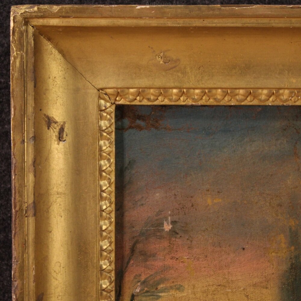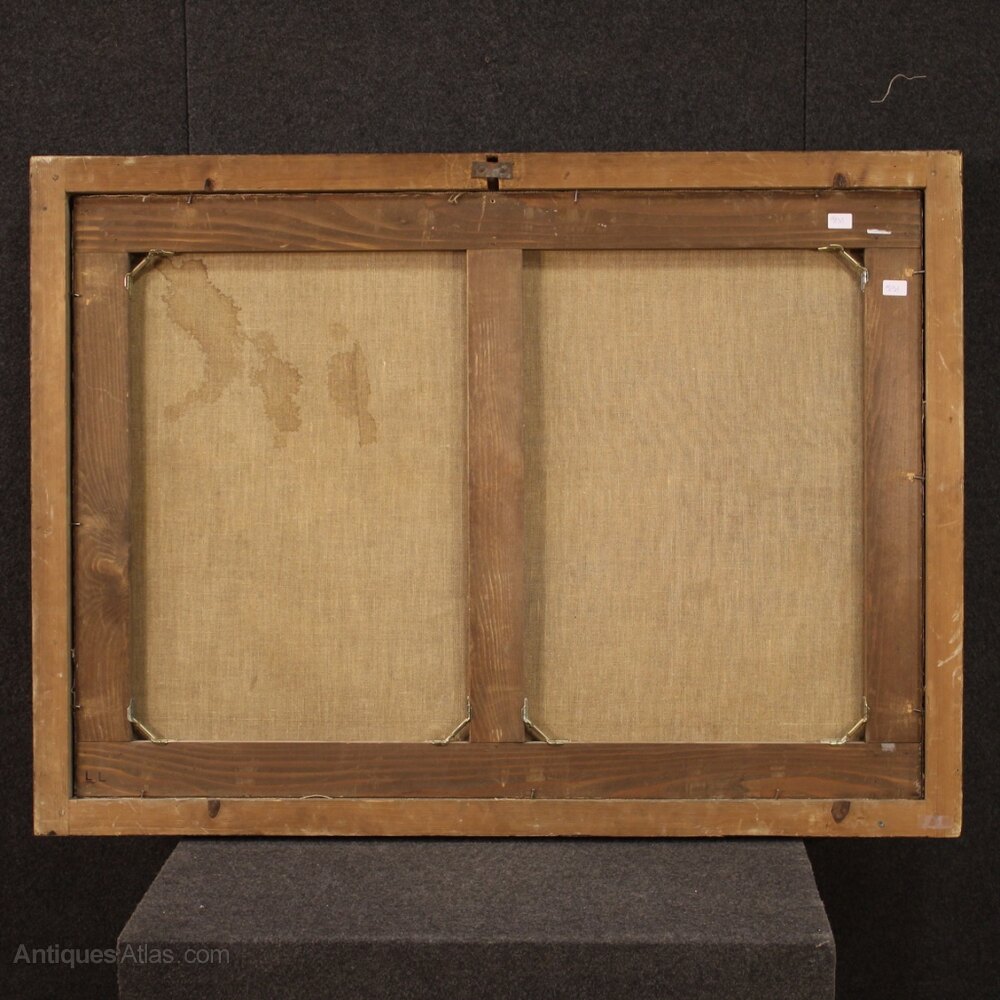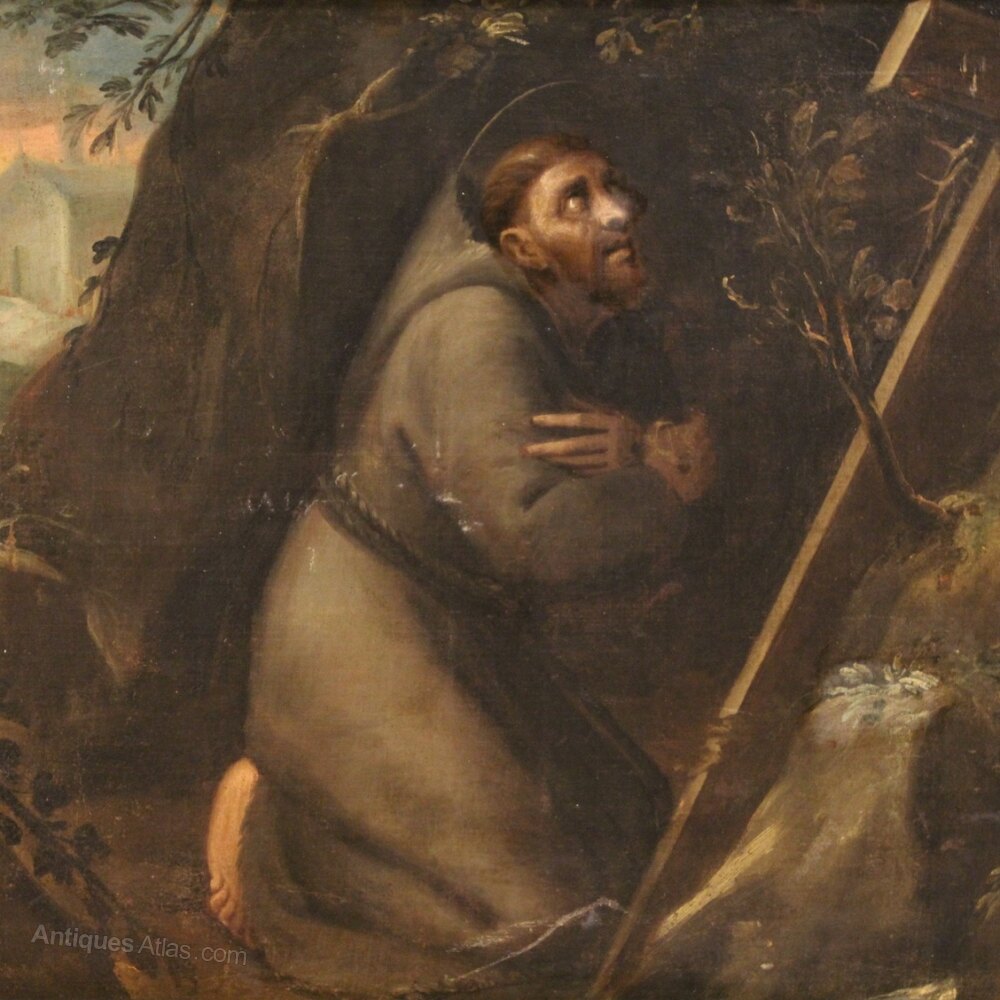 Ancient Italian painting from the first half of the 18th century. Oil on canvas framework depicting a religious subject Saint Francis of good pictorial quality. Wooden frame not coeval, from the 20th century, carved and gilded with signs of aging and drops of color (see picture). Painting of great measure and impact, for antique dealers, interior decorators and collectors of ancient sacred art. Framework that has undergone (in the second half of the 20th century) a conservative restoration, relining and replacement of the frame (see picture). Painting characterized by an interesting perspective with a view in the background at the top left (see picture). In good condition with some signs of aging. Sight size H 84 X W 119 cmAs each of our products will be accompanied by a certificate of authenticity and warranty and photographic documentation. Every item will be packed in a custom-made wooden box. Free shipping in Europe and UK (import and custom duties NOT included). Worldwide shipping at affordable prices, ask us a shipping quote. BUY IN INSTALLMENTS INTEREST FREE.