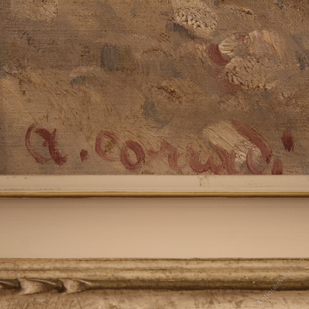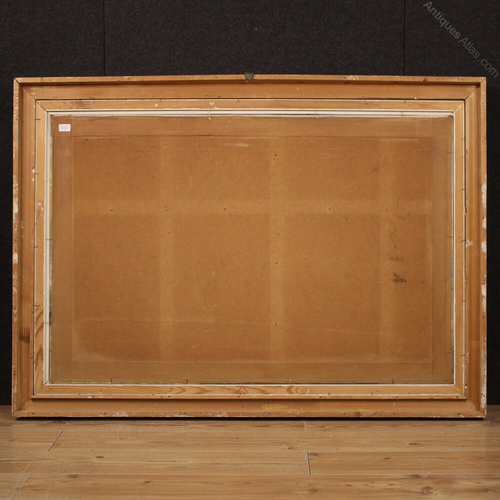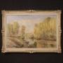 Italian painting from the mid-20th century. Oil painting on masonite depicting a countryside view, river landscape with boats and characters of good pictorial quality. Painting adorned with a beautifully decorated lacquered and gilded (bronze colored) wooden frame. Painting signed A. Corradi on the bottom left (see photo) referable to the painter Alfonso Corradi (1889-1972) lacking authentication. Painting of pleasant depth, ideal for placing in a living room or living room, for antique dealers and interior designers. The painter is good at creating the mirror on the river that reflects the boats, the sky and the trees (see photo). Artwork in good condition and beautiful patina, with some small signs of aging. Sight size H 78 x W 118 cmAs each of our products will be accompanied by a certificate of authenticity and warranty and photographic documentation. Every item will be packed in a custom-made wooden box. Free shipping in Europe and UK (import and custom duties NOT included). Worldwide shipping at affordable prices, ask us a shipping quote. BUY IN INSTALLMENTS INTEREST FREE.