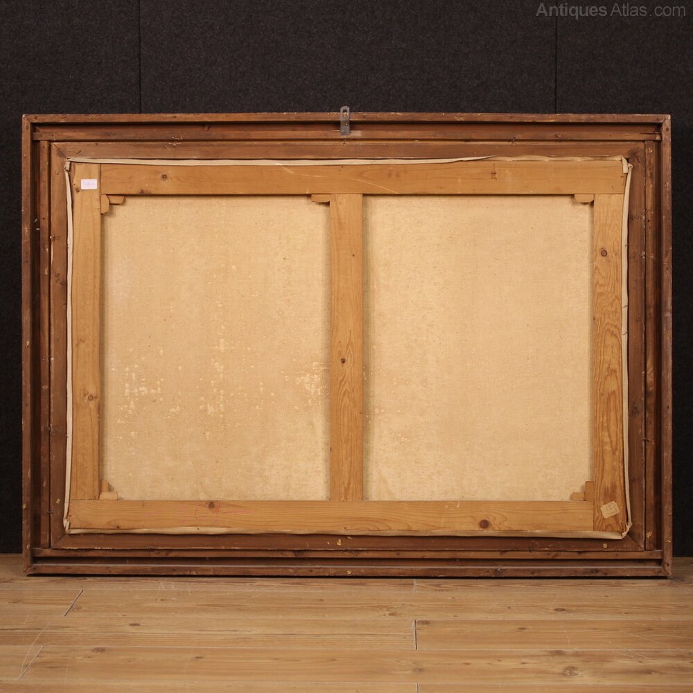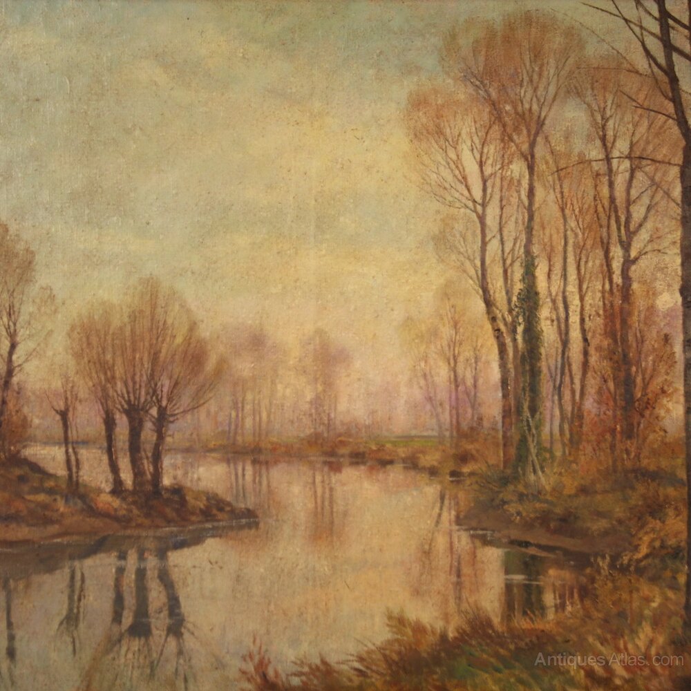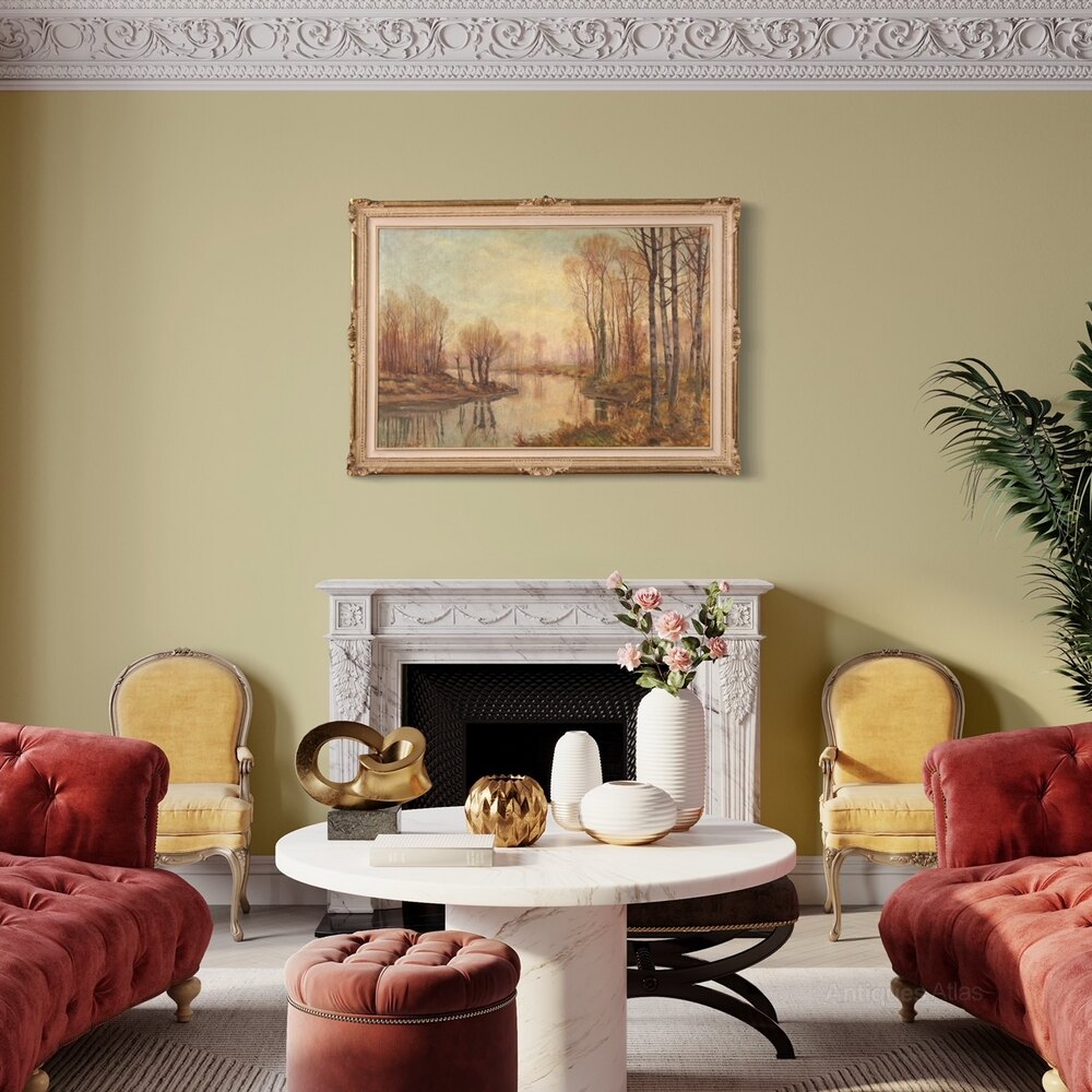 Italian painting from the mid-20th century. Oil on canvas artwork, first canvas, depicting an autumnal view, countryside river landscape of good pictorial quality. Painting adorned with a beautifully decorated lacquered and gilded (bronze tint) wooden frame, with some small loss of color. Artwork signed A. Corradi on the bottom left (see photo) referable to the painter Alfonso Corradi (1889-1972) lacking authentication. Painting of pleasant depth, ideal for placing in a living room or living room, for antique dealers and interior designers. The painter is good at creating the mirror on the river that reflects the sky and the trees (see photo) and the numerous autumnal shades. Work in patina, in good condition, with some signs of aging. Sight size H 78 x W 118 cm.As each of our products will be accompanied by a certificate of authenticity and warranty and photographic documentation. Every item will be packed in a custom-made wooden box. Free shipping in Europe and UK (import and custom duties NOT included). Worldwide shipping at affordable prices, ask us a shipping quote. BUY IN INSTALLMENTS INTEREST FREE.