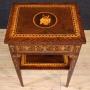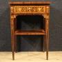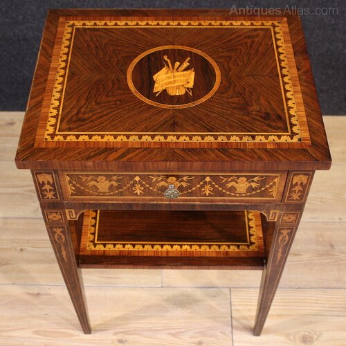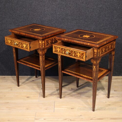 A pair of mid-20th-century Italian bedside tables. Finely inlaid Louis XVI-style furniture with floral decorations and musical instruments in walnut, rosewood, palisander, maple, and fruitwood. These tall-legged tables offer good stability and solidity, each with a drawer, a matching wooden top, and a second shelf underneath. These night stands are ideal for a bedroom or living room, and are ideal for antique dealers and interior decorators. Structurally sound and in good condition.As each of our products will be accompanied by a certificate of authenticity and warranty and photographic documentation. Every item will be packed in a custom-made wooden box. Free shipping in Europe and UK (import and custom duties NOT included). Worldwide shipping at affordable prices, ask us a shipping quote. BUY IN INSTALLMENTS INTEREST FREE.