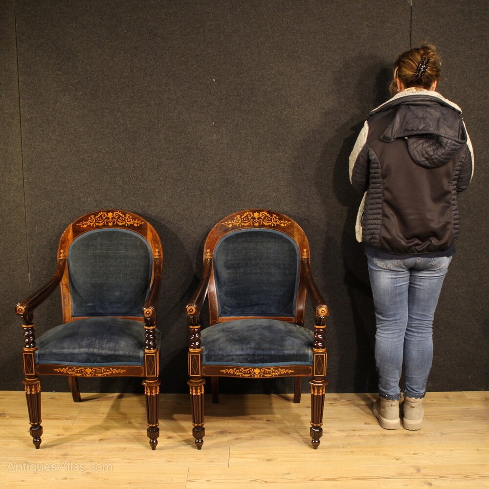 ConditionArmchairs showing some signs of age and small chips (see photos). Structurally sound, overall in good condition. Requires restoration.