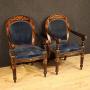 Upholstered in blue fabric with minor signs of wear, the padding offers excellent comfort, with a seat height of 48 cm. This hard-to-find furniture is part of a set of two pairs of armchairs, sold separately (see photo and request a price for the set, if available). The armchairs show some signs of age and small chips (see photo). One armchair has a small tear in the fabric on the back (see photo). Structurally sound, overall in good condition. Requires restoration.