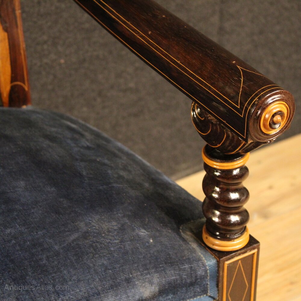 A pair of French armchairs from the first half of the 19th century. These exceptionally elegant and rare furniture feature neo-Gothic decorations, dating back to the Charles X era. These armchairs are finely veneered and inlaid in palisander and maple, with relief ornamentation. Resting on four sturdy legs, the front legs are distinguished by refined cabinetmaking craftsmanship, creating neo-Gothic motifs and geometric inlays.The rear legs are saber-shaped. The armrests are also exquisitely crafted, featuring two small twisted columns supporting a sculpture reminiscent of a shell (see photo). These armchairs are inlaid with precise geometric decorations and delightful floral motifs, making them truly delightful.