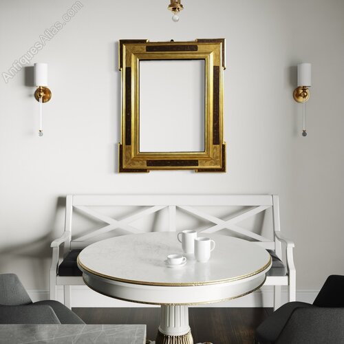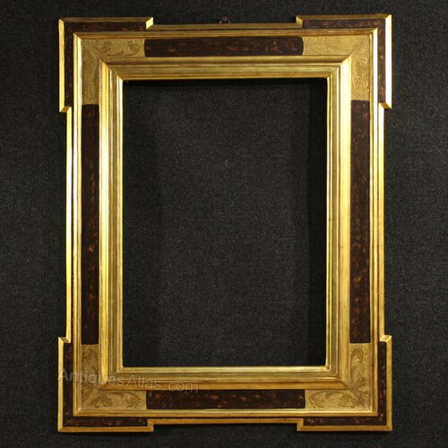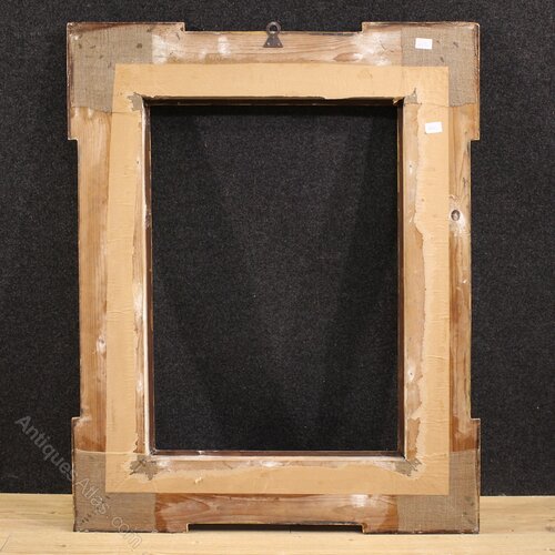Italian frame from the first half of the 20th century. Finely carved, chiseled, gilded, and painted wood with a marbled effect of excellent quality. The frame can accommodate a mirror or painting with the following maximum dimensions: H 75 x W 54 cm (rear recess).A beautifully proportioned piece of furniture, easily adaptable to various locations in the home, ideal for antique dealers and interior decorators. It can be hung vertically or horizontally by moving the appropriate hook. This frame has a pleasing impact. Structurally sound and solid, it has undergone conservative restoration over time. The frame is in good condition.