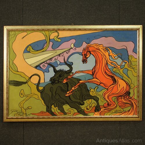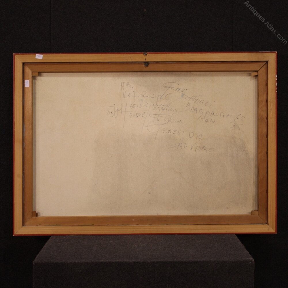 Italian painting from the second half of the 20th century. Framework mixed media on canvas depicting an abstract subject entitled «Genesis to save» signed lower left (see picture), signature under study. Painting with a nice size and pleasant impact, characterized by bright colors and great dynamism. Modern carved and silvered wooden frame of beautiful decoration. There are references to the artist on the back of the canvas (see picture) under study. This painting can be easily inserted in different parts of the house, for antique dealers, interior decorators and collectors of modern Italian painting. The frame is slightly bent, the painting is overall in a good state of conservation. Sight size H 79 X W 119 cmAs each of our products will be accompanied by a certificate of authenticity and warranty and photographic documentation. Every item will be packed in a custom-made wooden box. Free shipping in Europe and UK (import and custom duties NOT included). Worldwide shipping at affordable prices, ask us a shipping quote. BUY IN INSTALLMENTS INTEREST FREE.