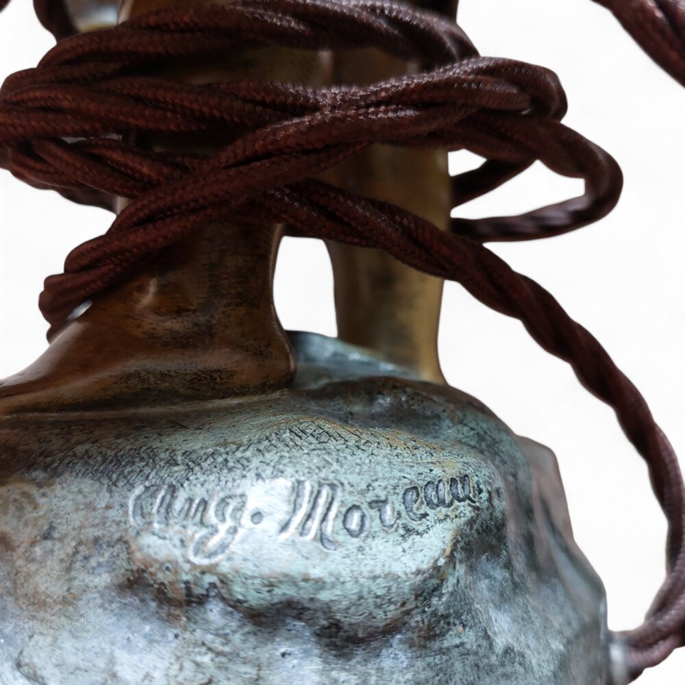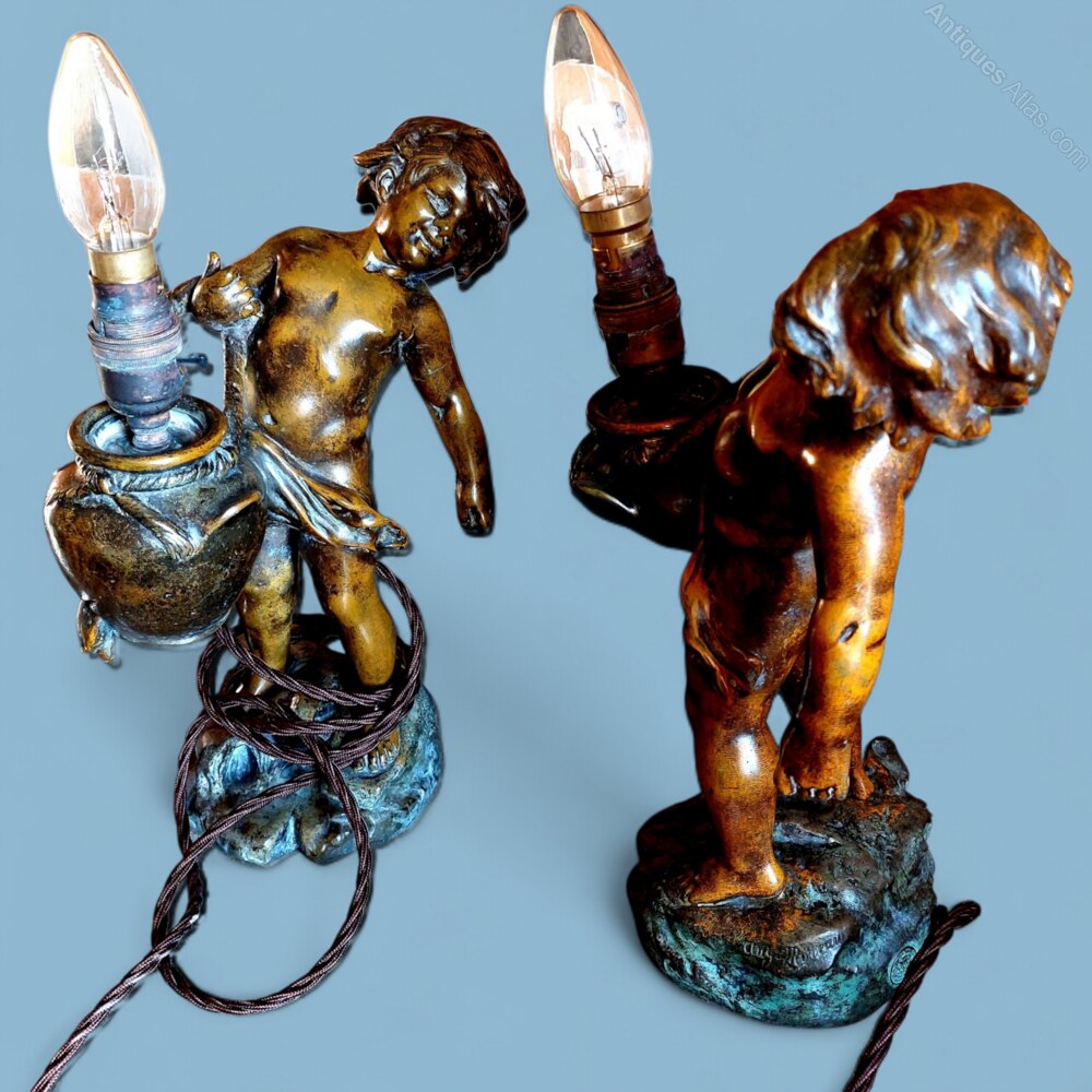 A very well cast matching pair of bronzed spelter cherub table lamps by the renowned modeller Aug. Moreau. Both lamps are signed and with the Paris foundry mark. Dating to the early 1900s. Still retaining a beautiful mid brown patination to the figures and a green patination to the bases. In very good condition. They have been sympathetically cleaned and rewired with traditional flex and a switched lamp holder. Ready to use with your choice of shade or can be used without shades. 13" tall x 7 1/2" wide x 5" deep.UK MAINLAND DELIVERY TRACKED AND INSURED INCLUDED IN PRICE.