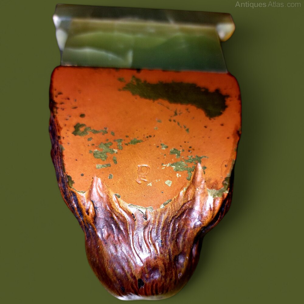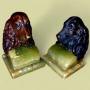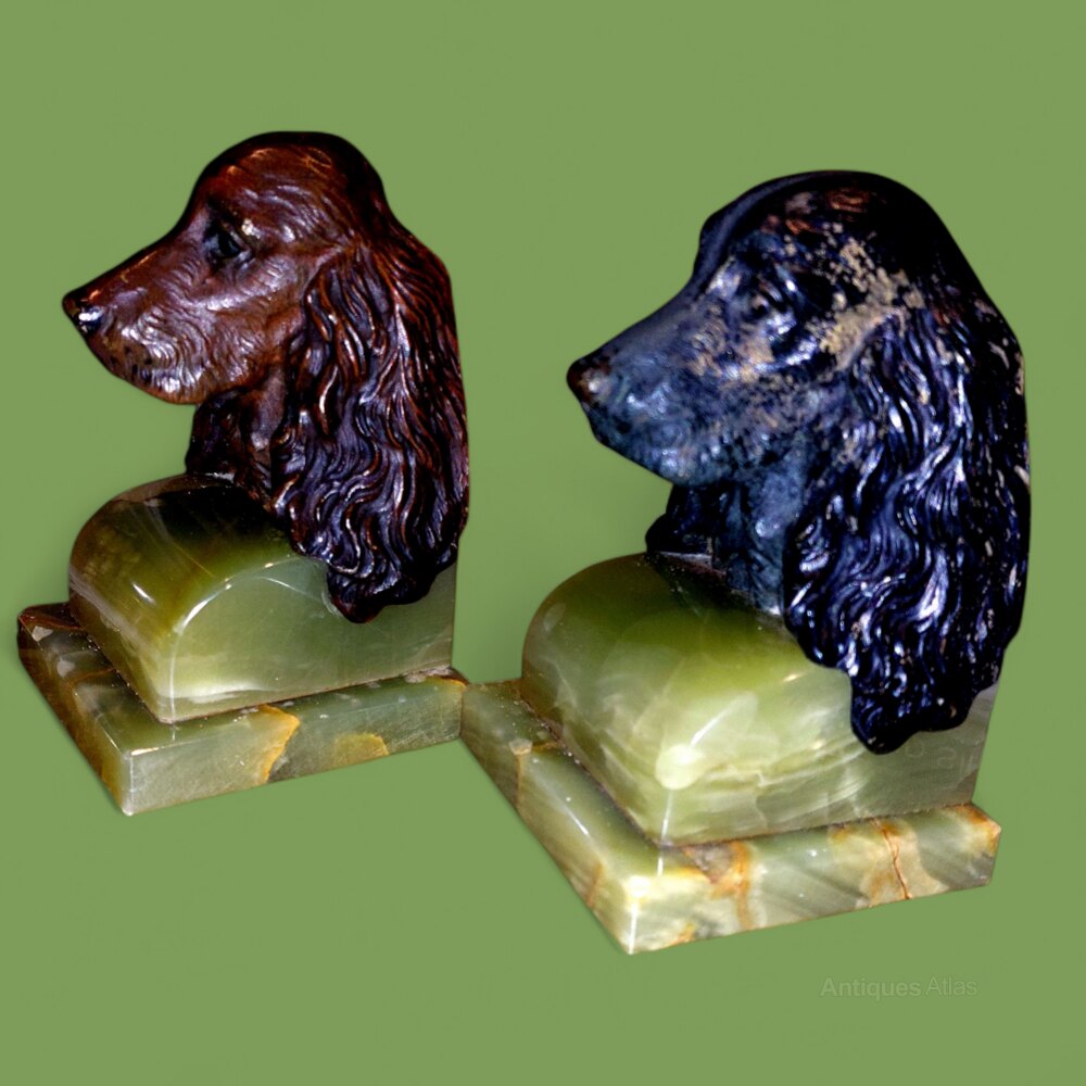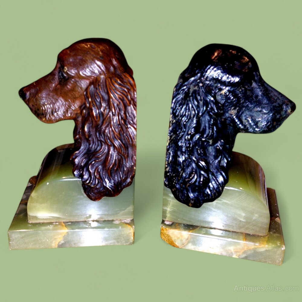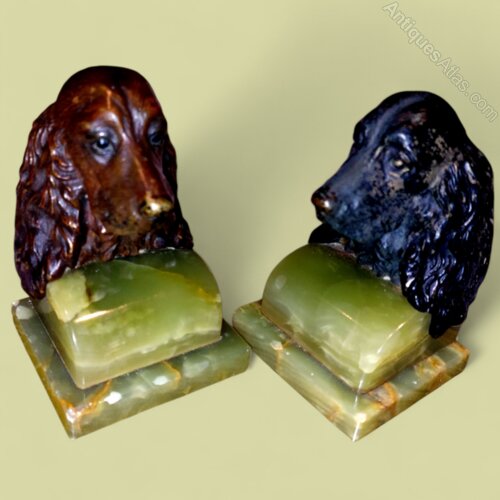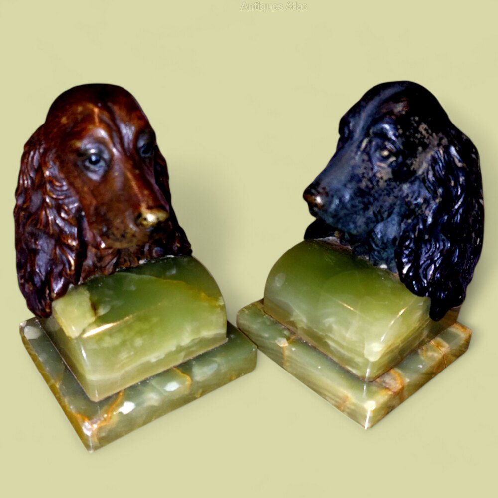 A fantastic pair of Austrian cold painted bronze heads of spaniels mounted on green onyx. Made to be used as bookends or can be used as paperweights. One black dog and one brown one. In good original condition with only minor nips to the onyx as can be expected. I would date these to the 1930s. Impressed mark to the rear of brown dog (see pic 6). Very good weight and size. 5" tall x 3 1/8" wide x 3" deep. Each dog weighs 1.3 kilos. Very good condition.UK MAINLAND DELIVERY TRACKED AND INSURED INCLUDED IN PRICE.