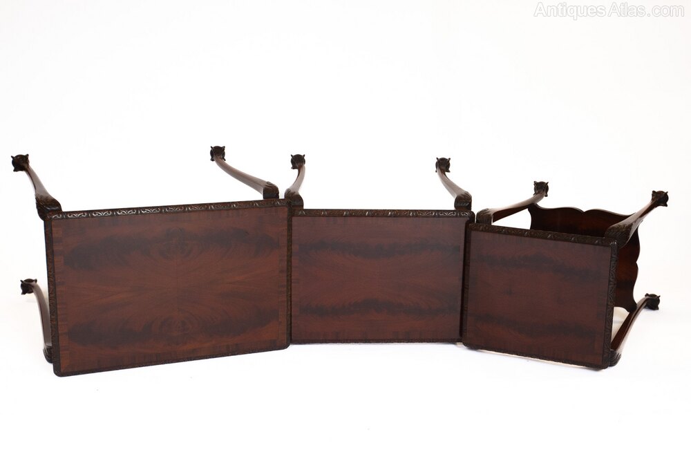 Fine Nest of 3 Figured Mahogany & Carved Nest of tablesCirca 1930s