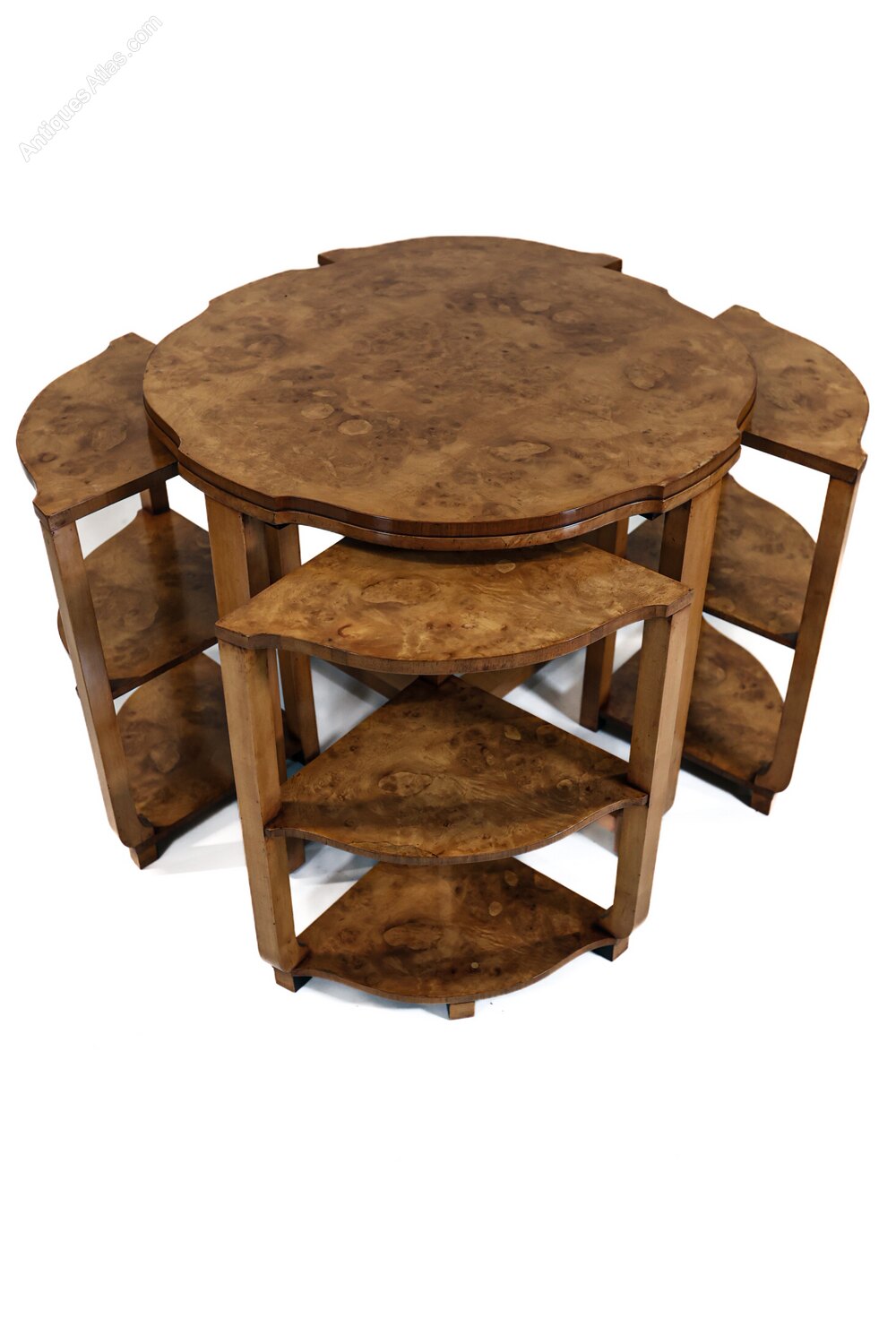 Art Deco Burr Walnut Nest of 4 tables 1930sShaped top With Burr Walnut Veneer,