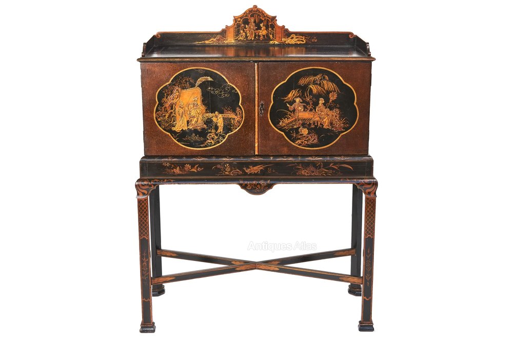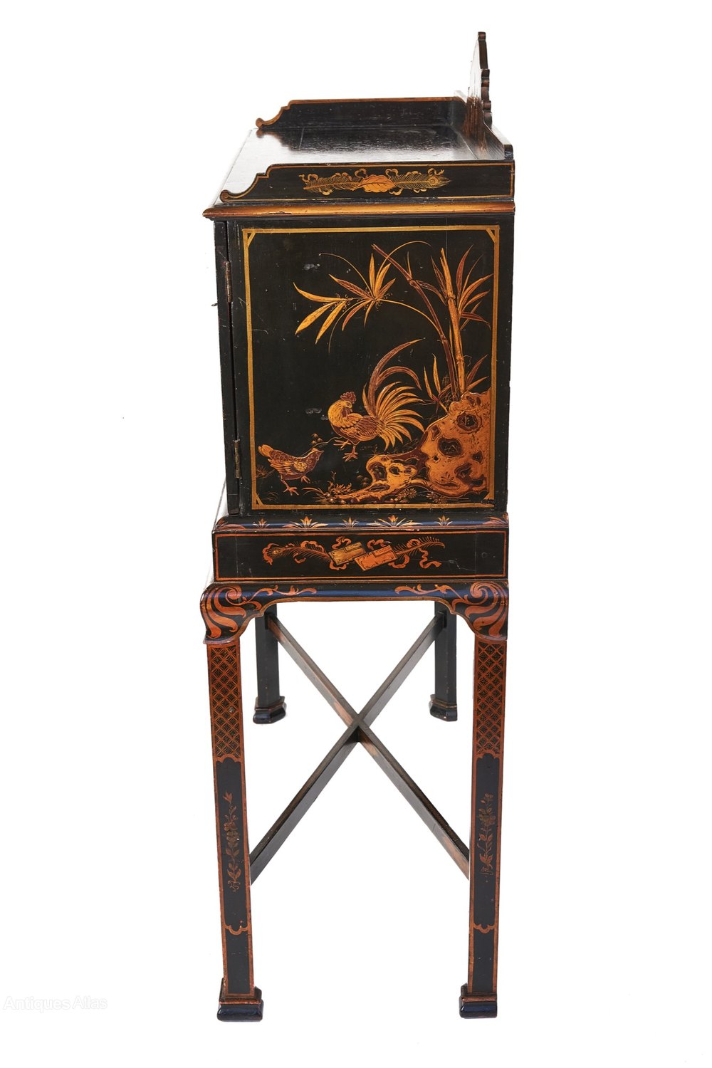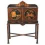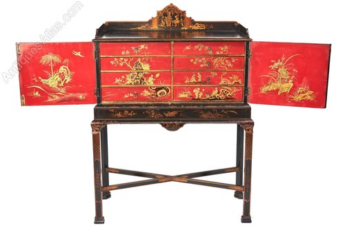 Fine Chinoiserie Decorated fitted 8 drawer Cabinet on stand circa 1900Three Quarter tray top with shaped back depicting: