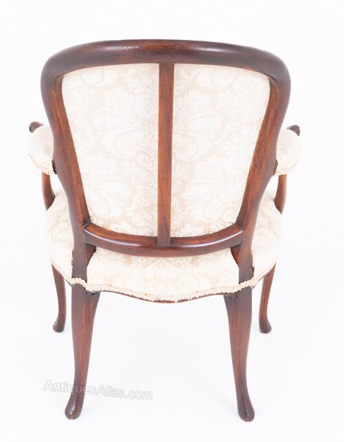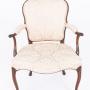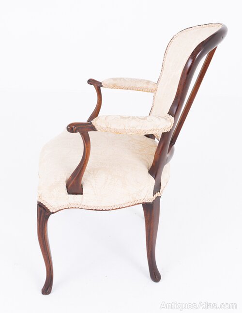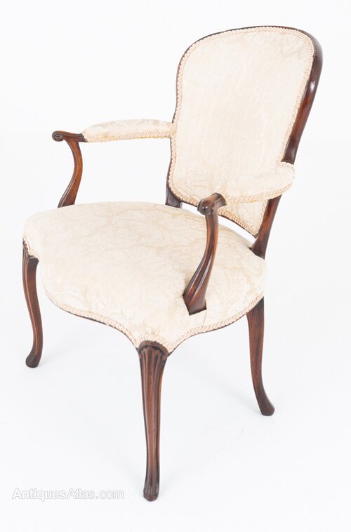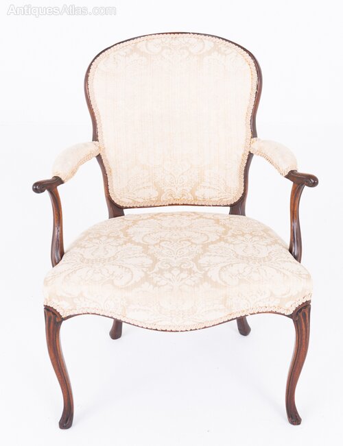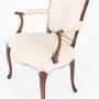 A refined pair of mahogany open armchairs in the elegant Hepplewhite style. Each chair stands on graceful cabriole front legs with swept-back rear legs, giving the pieces a balanced and sophisticated silhouette.The serpentine-shaped stuffed-over seats provide comfort while complementing the flowing lines of the frame. Padded arms rest on shaped supports, adding both elegance and practicality. The upholstered backs are of a wood-show form, highlighting the quality and craftsmanship of the mahogany frame.