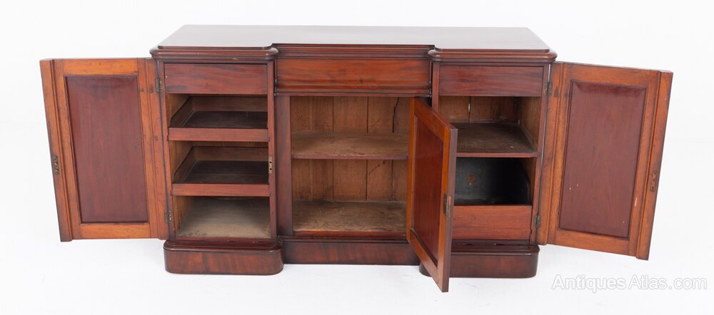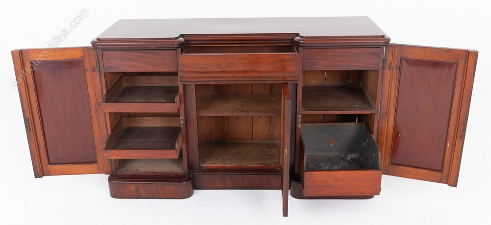 A fine Victorian mahogany three-door sideboard, elegantly raised on a plinth base. The piece is crafted in an attractive inverted form, showcasing both balance and proportion.The panelled doors open to reveal a well-appointed interior fitted with mahogany sliding trays and drawers, offering practical storage. The doors themselves are particularly striking, displaying beautifully figured flame mahogany timbers with rich depth and character.