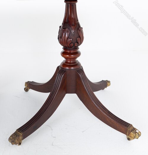 The table is raised on four substantial pedestal bases, each featuring elegantly turned and carved columns supported by four fluted, swept legs, terminating in brass claw castors for both practicality and period charm.