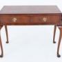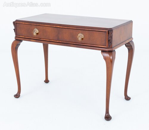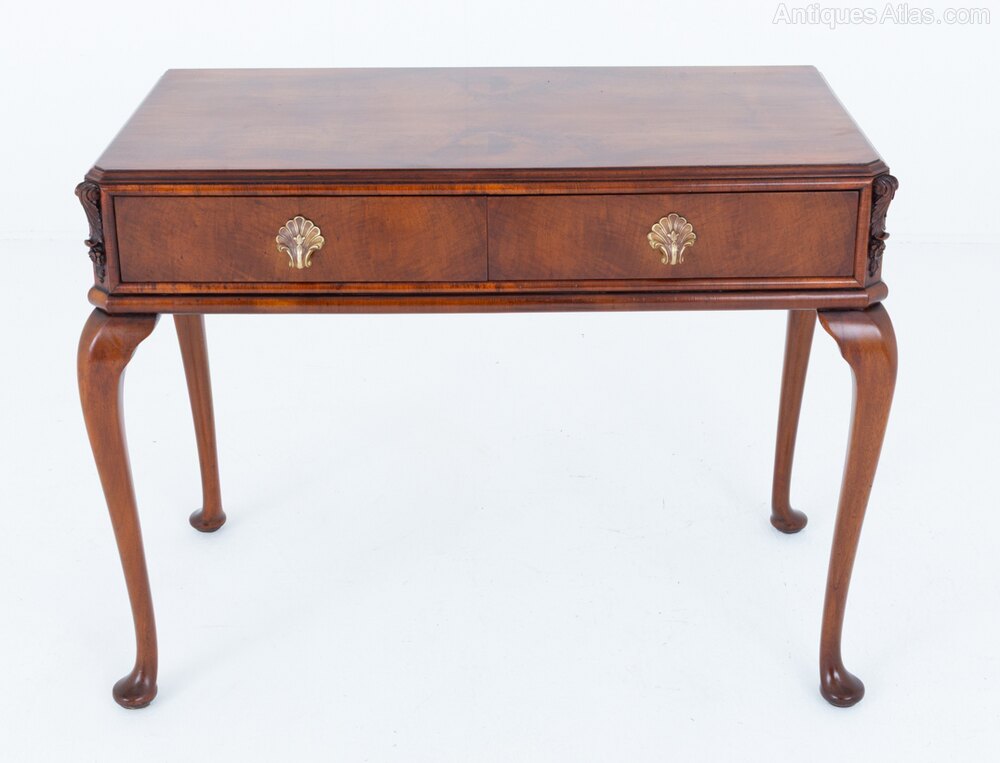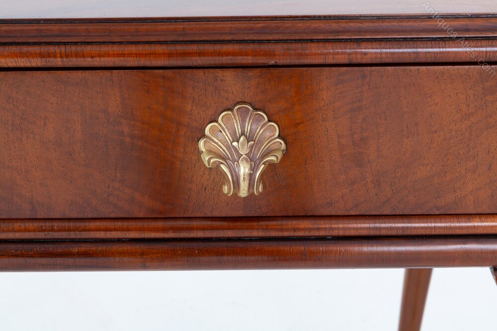 The table is fitted with two mahogany-lined drawers, each retaining attractive shell-form handles, adding a decorative flourish to the otherwise restrained design. The walnut displays warm tones and pleasing figuring, enhancing the overall appeal of the piece.