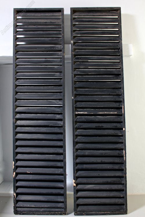 A good set of 10 wooden window exterior window shutters. Painted black, the original surface slightly peeling, they were used as decorative wall adornments so are in good condition. Mid 20th century.Height 183cm (72 inches)