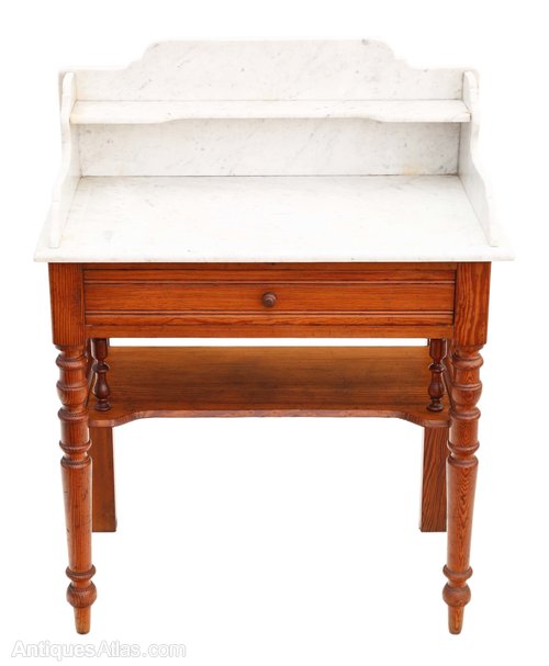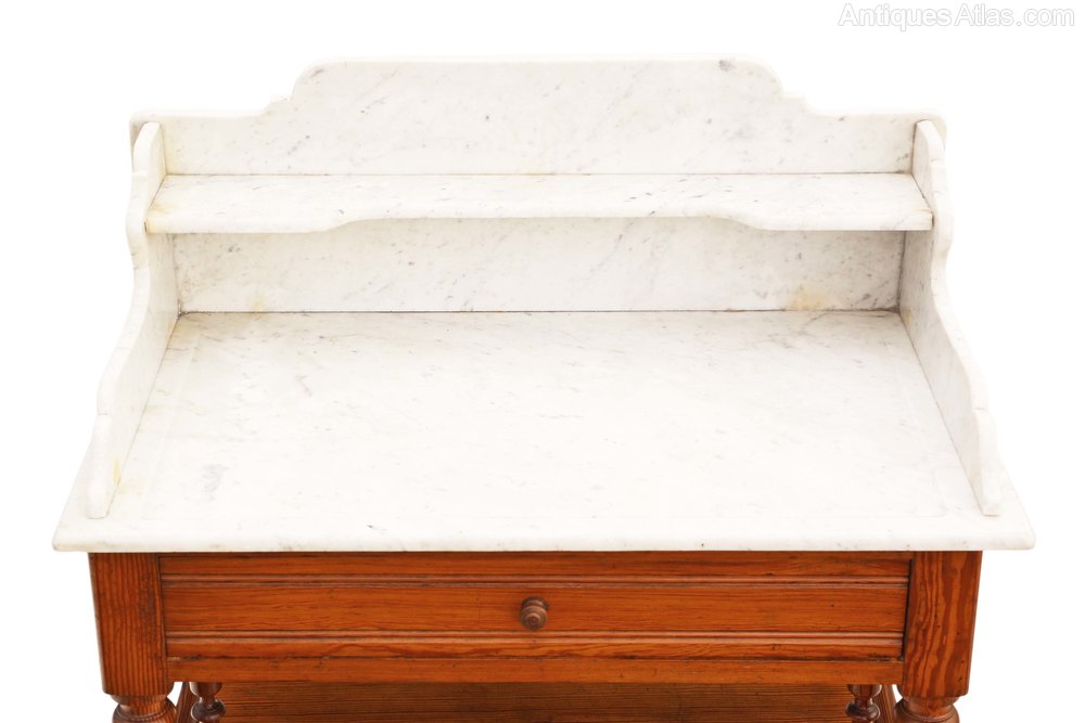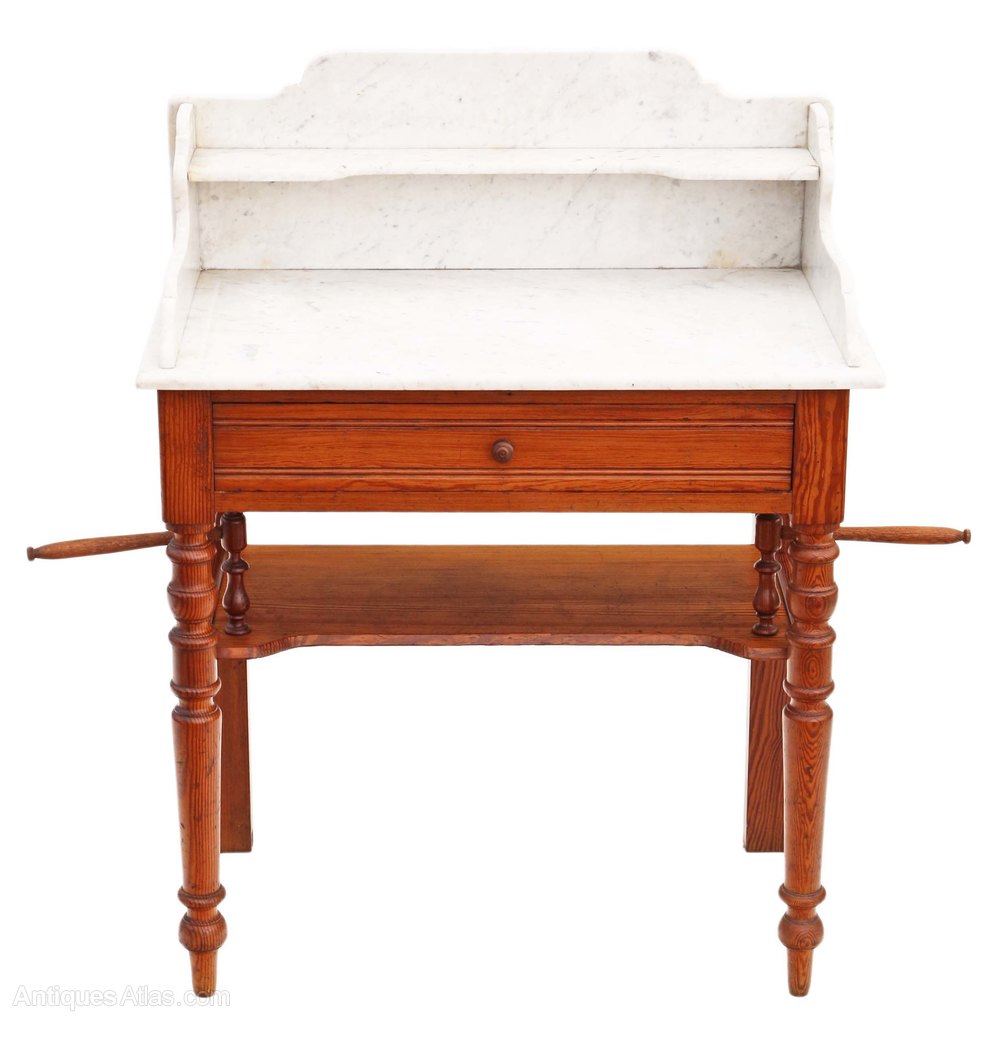 Antique fine quality pitch pine and marble wash stand C1900 with compact proportions. Just right for a smaller bathroom or basin conversion.Solid and strong, with no loose joints or woodworm and in good working order. Has a drawer that slides freely and two fold out towel rails.