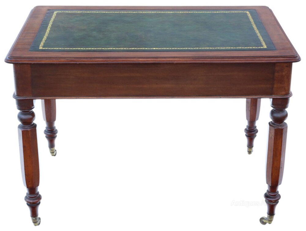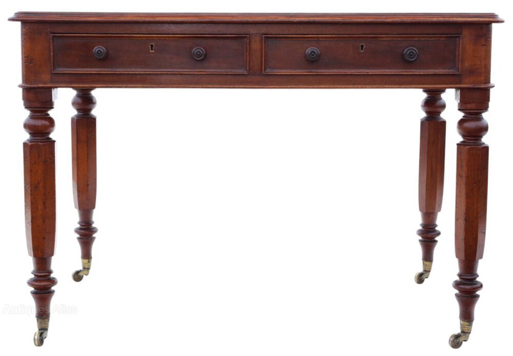 Antique 19th Century Mahogany Writing Desk – Elegant Dressing Table or Side Table with Octagonal Legs and Brass CastorsThis fine quality 19th-century antique mahogany writing desk is a highly sought-after piece, ideal as a dressing table or side table. Featuring classic octagonal legs on original brass cup castors, it offers timeless style and practical elegance.