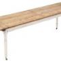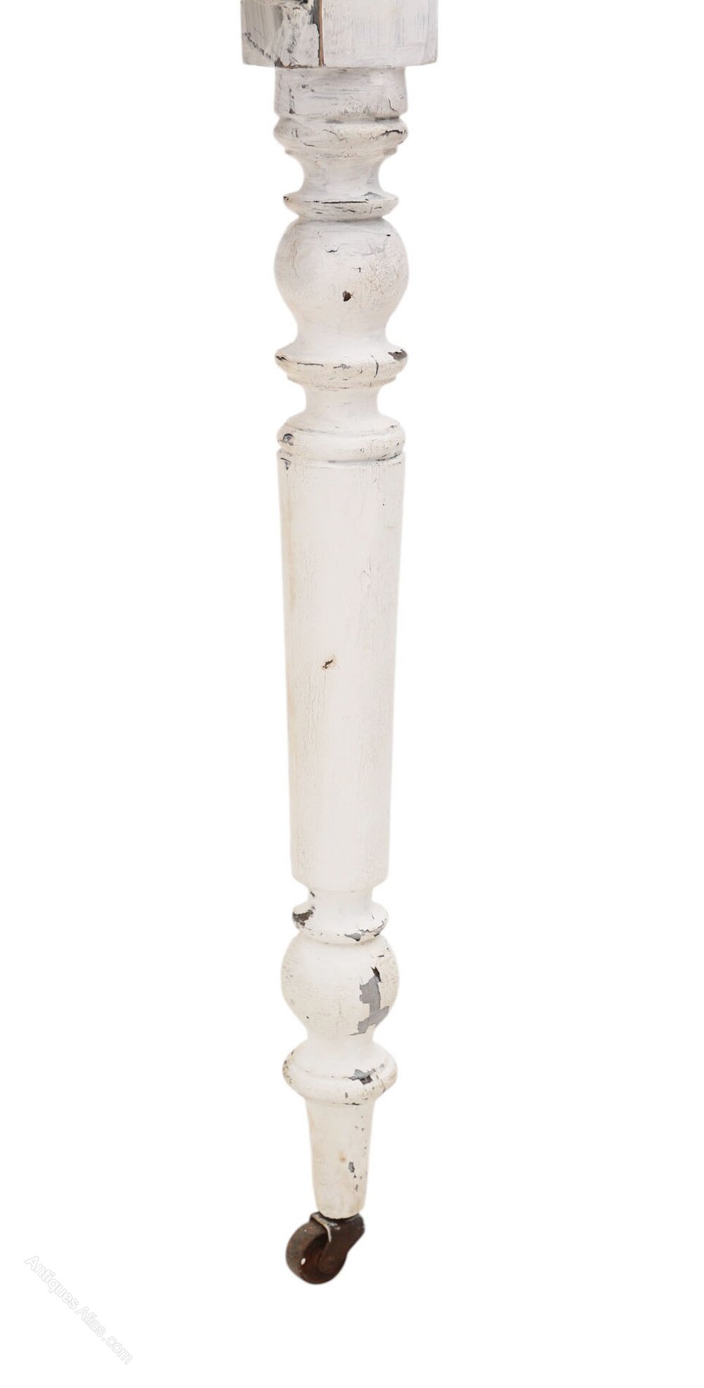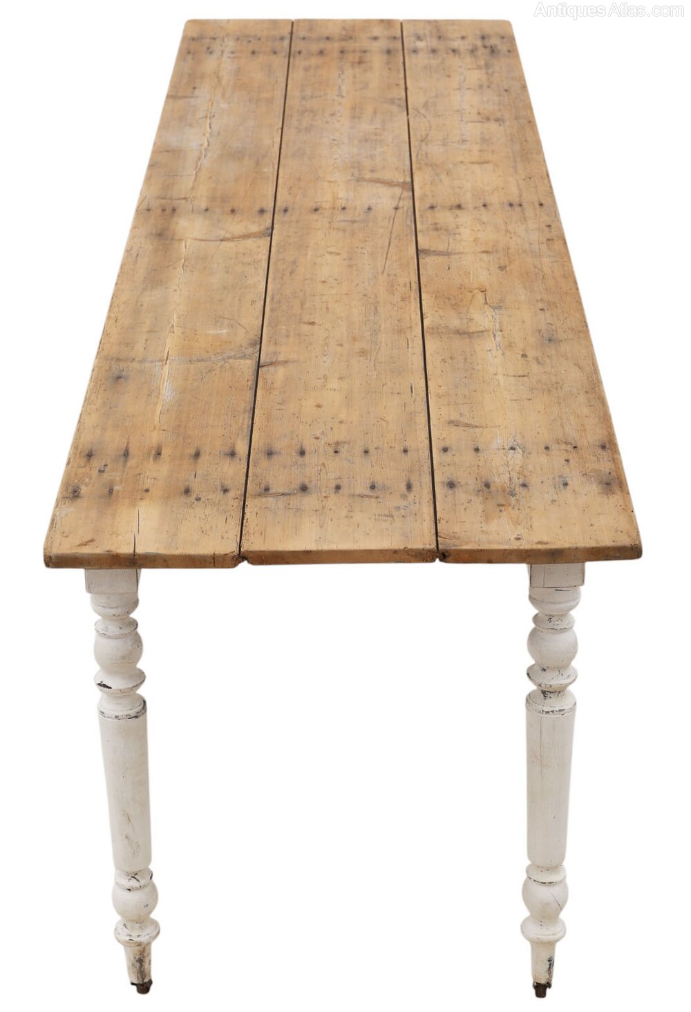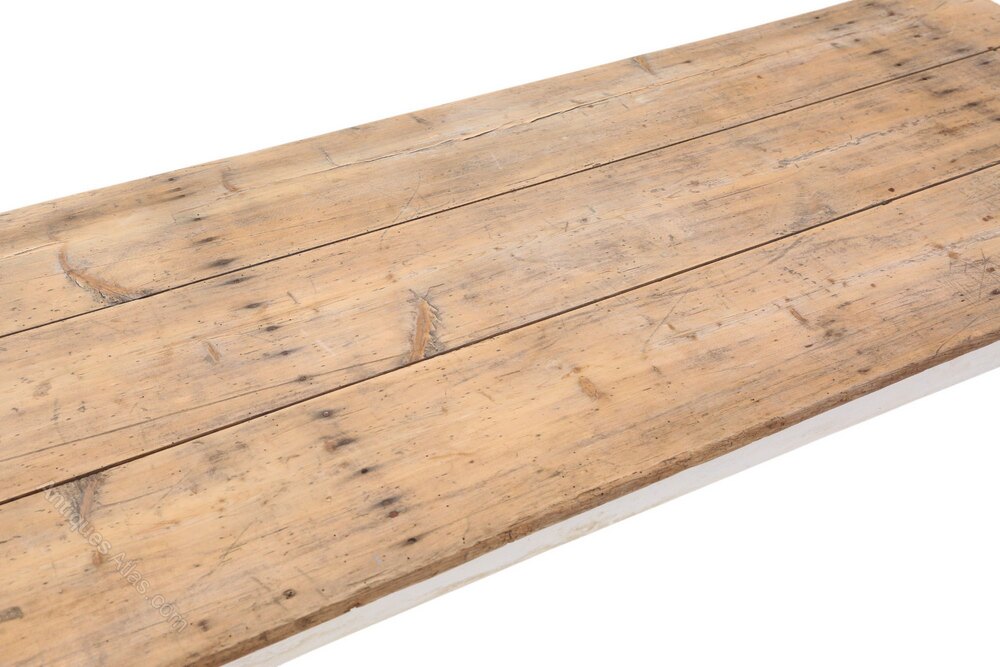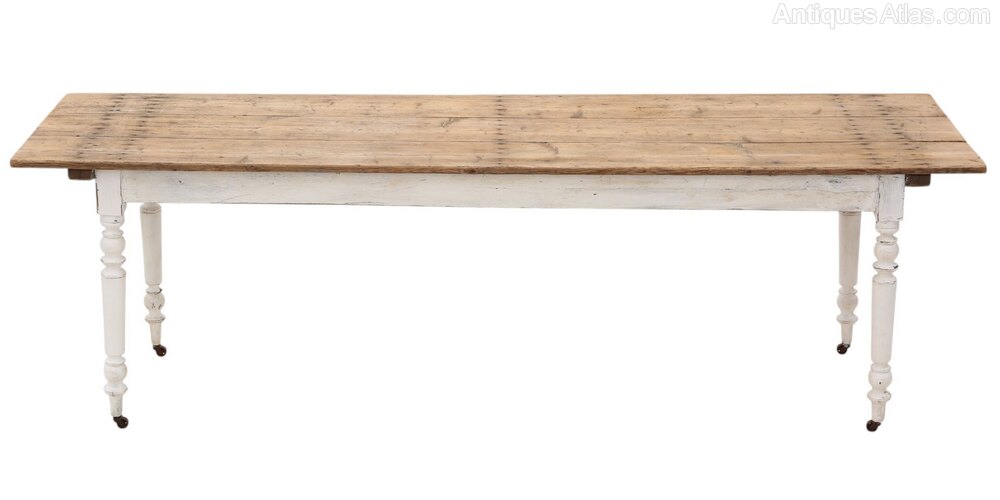 Antique Large Long Pine Refectory Dining Table – Kitchen Farmhouse Table c.1900A charming and practical antique table dating from the late 19th to early 20th century, with a beautifully patinated pine top. Its long, narrow proportions and rustic character make it ideal as a kitchen dining or serving table, blending seamlessly into both traditional and eclectic interiors. The base retains traces of old, worn white paint, adding to its farmhouse appeal.