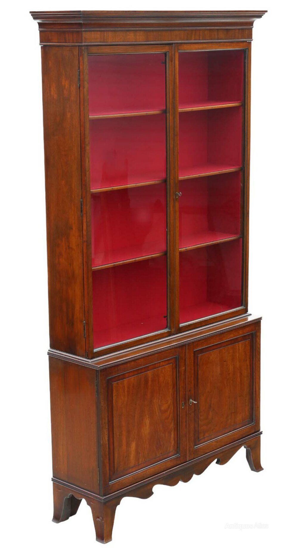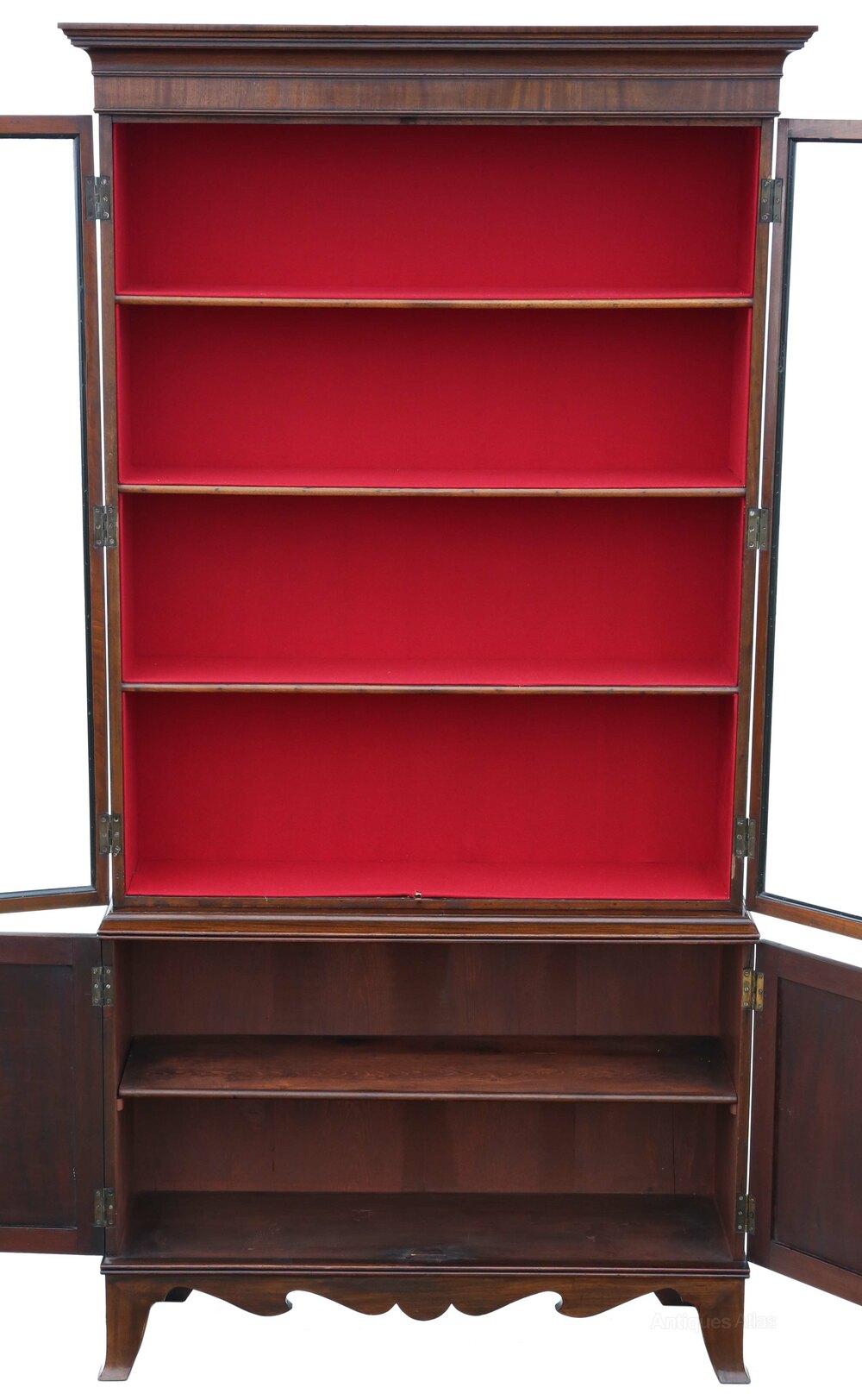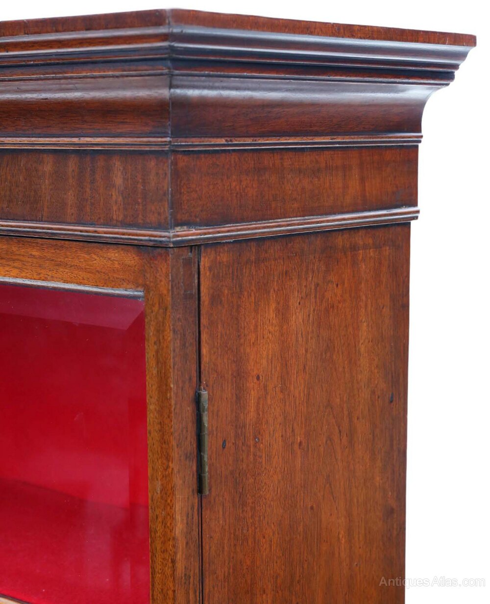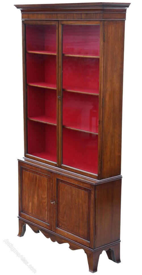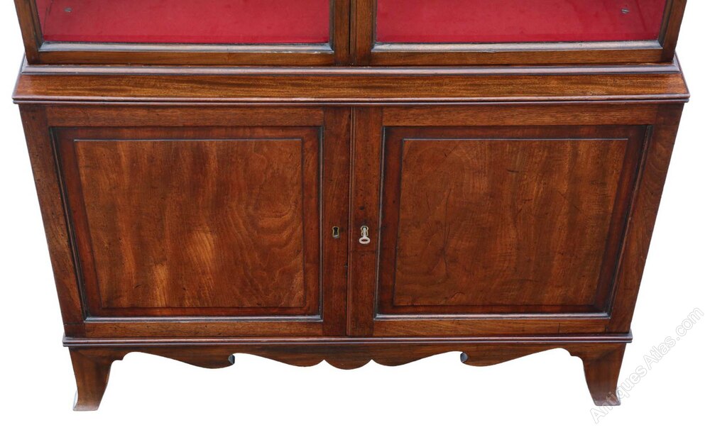 Very Large Antique Georgian Mahogany Bookcase – High-Quality 19th Century Display CabinetFull of authentic charm and character, this very large 19th Century mahogany bookcase/ display cabinet is a fine example of quality Georgian craftsmanship, with a simple and clean design. While recently restored to a good standard and fitted with new felt lining, it retains a rich colour, age, and patina.